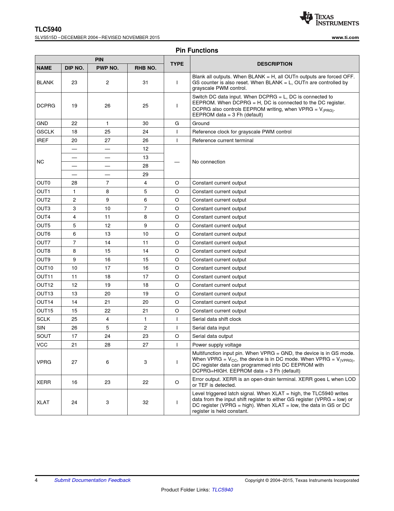 TLC5940. www.ti.com. Pin Functions. PIN. TYPE. DESCRIPTION. NAME. DIP NO. PWP NO. RHB NO