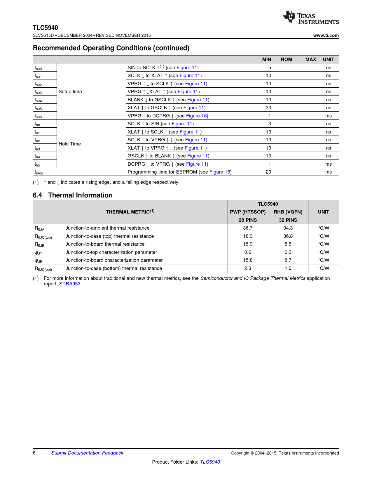 TLC5940. www.ti.com. Recommended Operating Conditions (continued). MIN. NOM. MAX. UNIT. 6.4 Thermal Information. THERMAL METRIC(1)