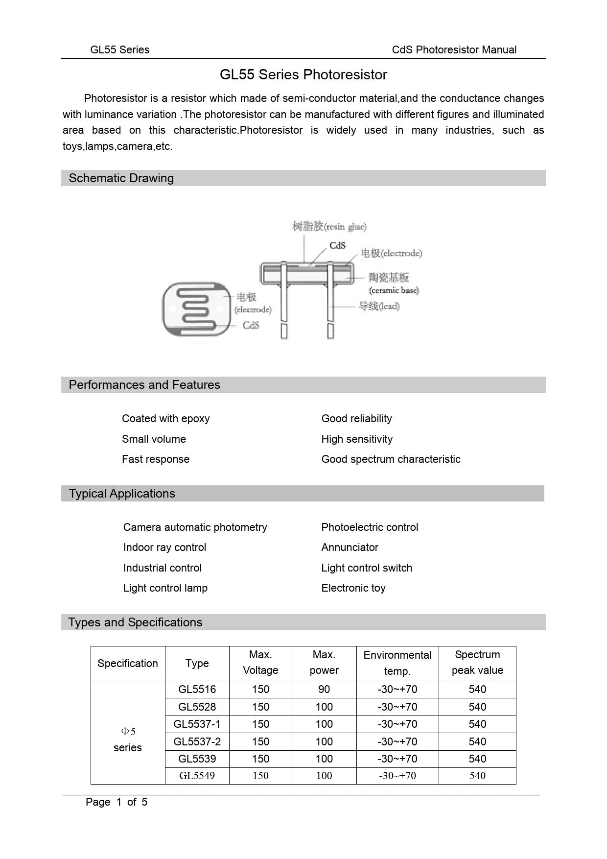GL55 Series CdS Photoresistor Manual GL55 Series Photoresistor Photoresistor is a resistor which made of semi-conductor material,and the conductance changes with luminance variation .The photoresistor can be manufactured with different figures and illuminated area based on this characteristic.Photoresistor is widely used in many industries, such as toys,lamps,camera,etc. Schematic Drawing Performances and Features Coated with epoxy Good reliability Small volume High sensitivity Fast response Good spectrum characteristic Typical Applications Camera automatic photometry Photoelectric control Indoor ray control Annunciator Industrial control Light control switch Light control lamp Electronic toy Types and Specifications Max. Max. Environmental Spectrum Specification Type Voltage power temp. peak value GL5516 150 90 -30~+70 540 GL5528 150 100 -30~+70 540 GL5537-1 150 100 -30~+70 540 Φ5 GL5537-2 150 100 -30~+70 540 series GL5539 150 100 -30~+70 540 GL5549 150 100 -30~+70 540 ________________________________________________________________________________________________________ Page 1 of 5