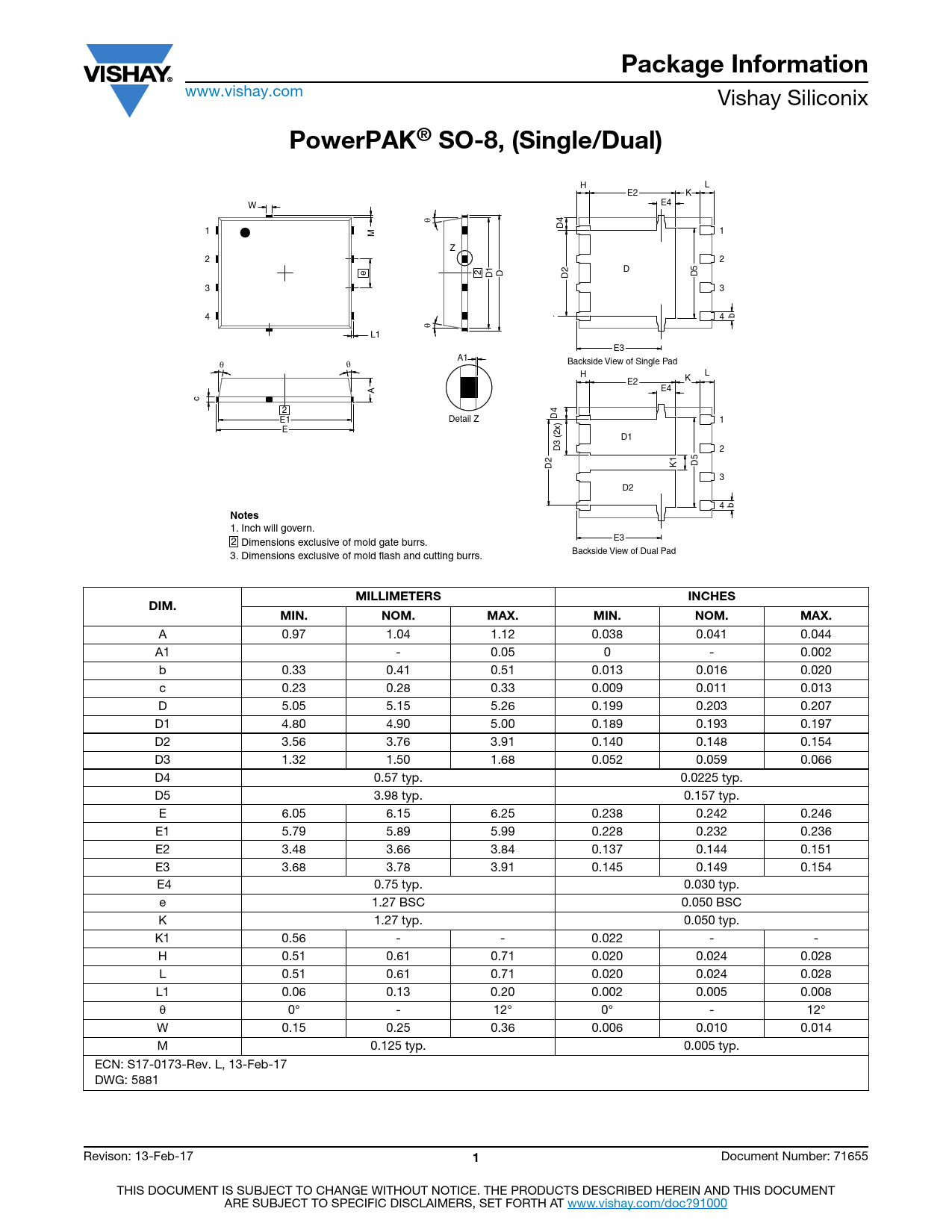 Package Information. PowerPAK® SO-8, (Single/Dual). Notes. MILLIMETERS. INCHES. DIM. MIN. NOM. MAX