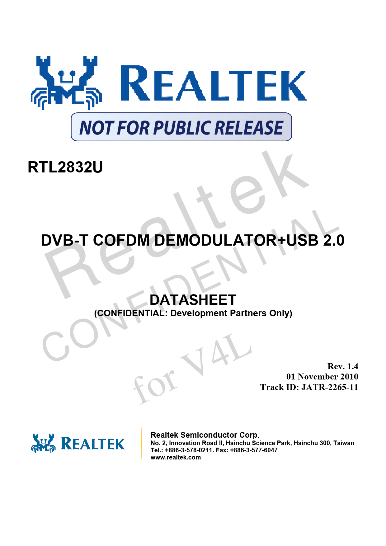 RTL2832U k e t l a e R L IA T N DVB-T COFDM DEMODULATOR+USB 2.0 E ID F N DATASHEET (CONFIDENTIAL: Development Partners Only) O C r fo L 4 V Rev. 1.4 01 November 2010 Track ID: JATR-2265-11 Realtek Semiconductor Corp. No. 2, Innovation Road II, Hsinchu Science Park, Hsinchu 300, Taiwan Tel.: +886-3-578-0211. Fax: +886-3-577-6047 www.realtek.com