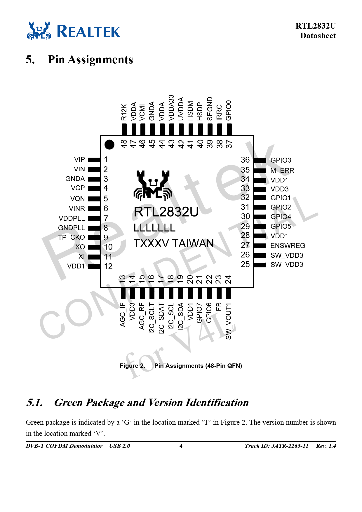 RTL2832U. Datasheet VDDA. VDDA33. UVDDA. HSDM. HSDP. SEGND. IRRC. GPIO0 Pin Assignments k. t 48. 37 R12K. VDDA. VCMI. GNDA 5. l