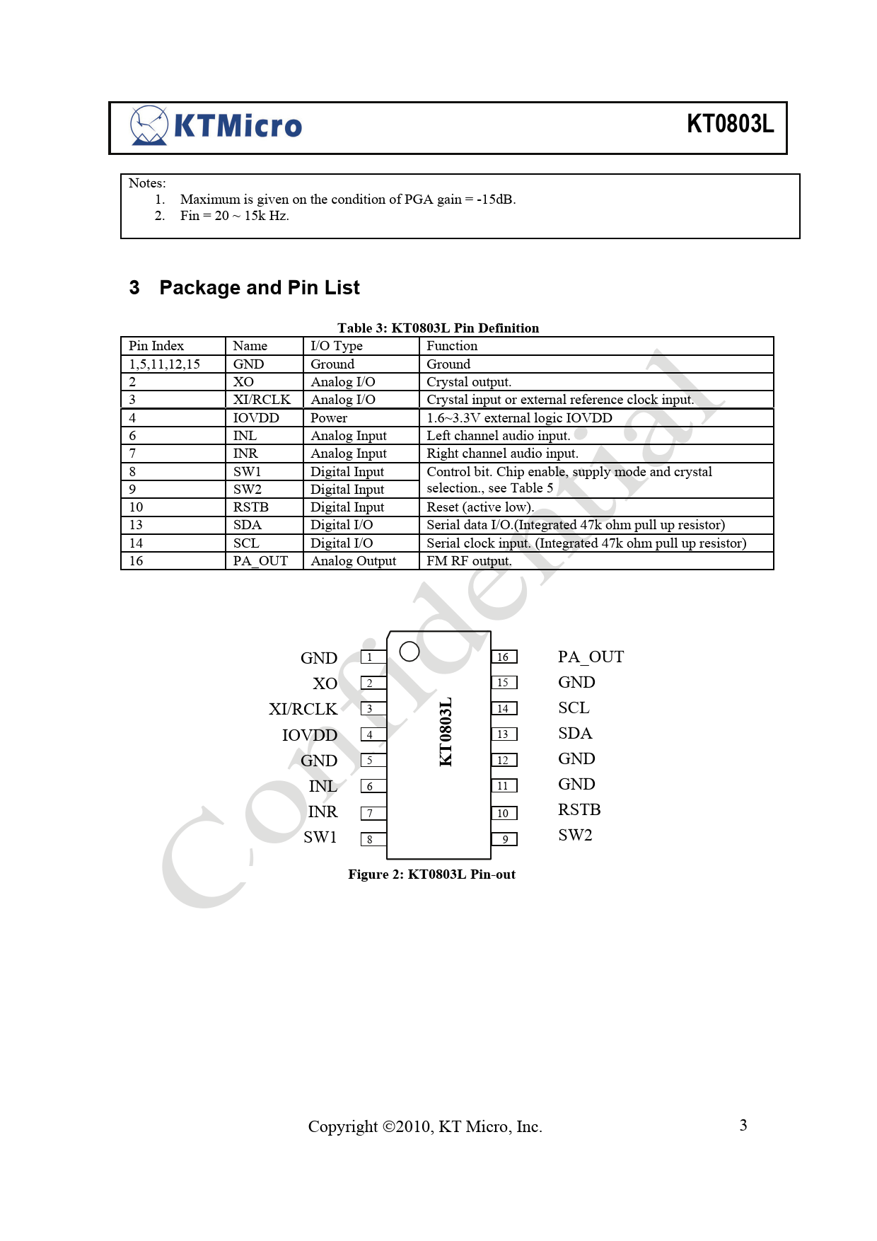 3 Package and Pin List Table 3: KT0803L Pin Definition