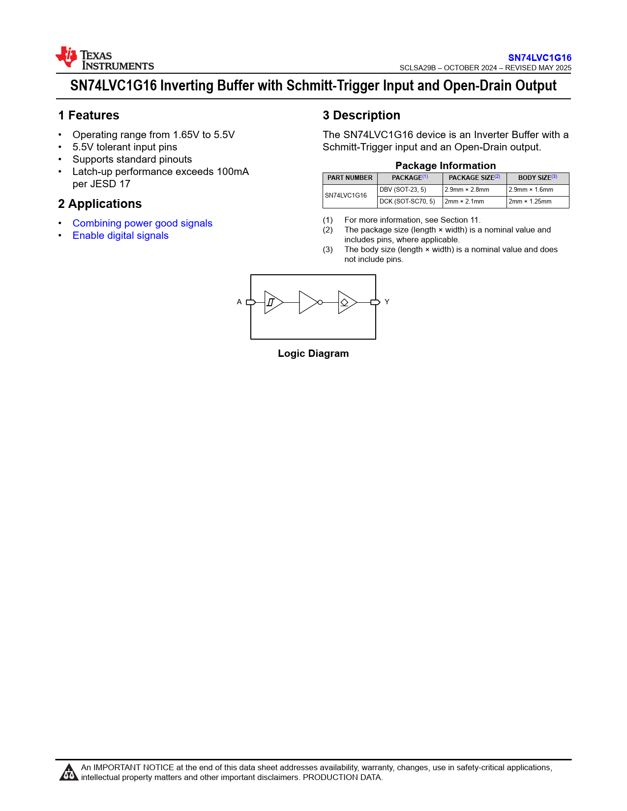 SN74LVC1G16. SN74LVC1G16 Inverting Buffer with Schmitt-Trigger Input and Open-Drain Output. 1 Features. 3 Description