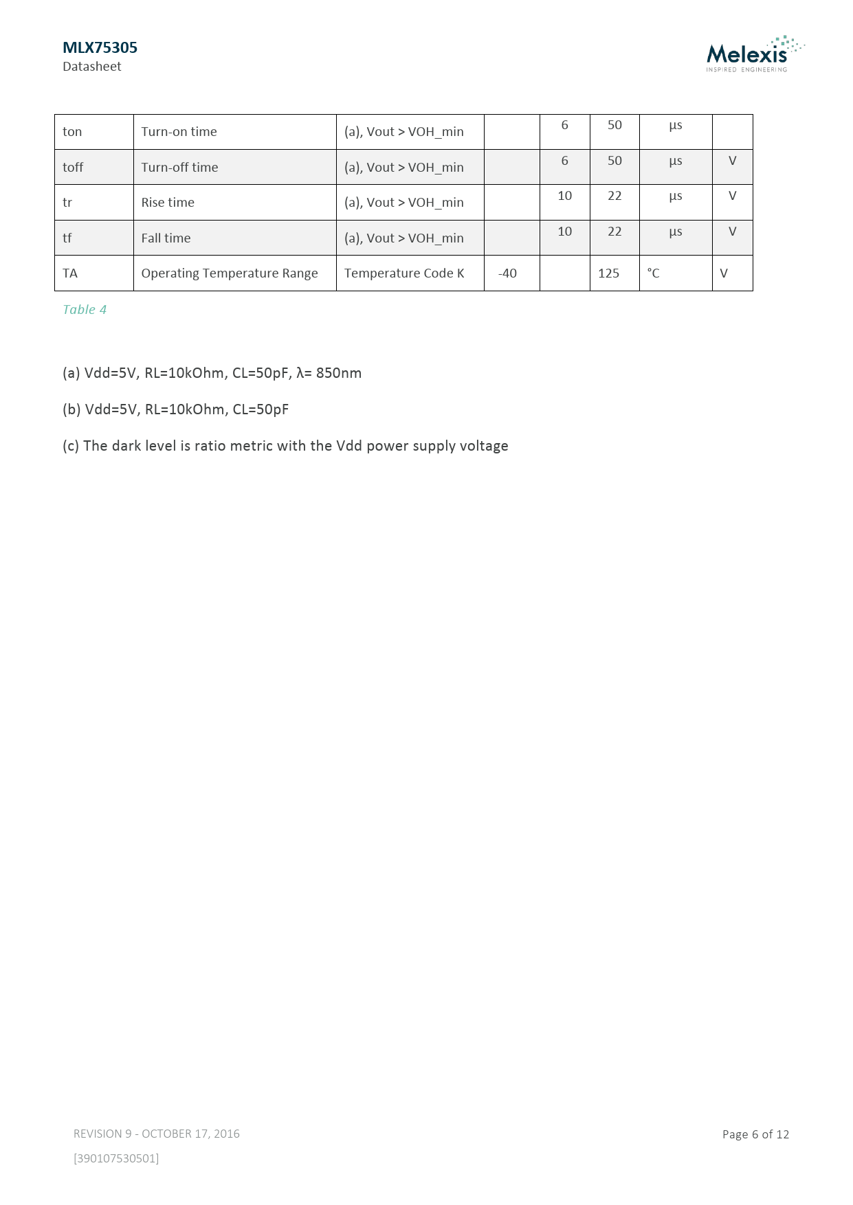 Datasheet ton Turn-on time (a), Vout > VOH_min 6 50 µs toff Turn-off time (a), Vout > VOH_min 6 50 µs V tr Rise time (a), Vout > VOH_min 10 22 µs V tf Fall time (a), Vout > VOH_min 10 22 µs V TA Operating Temperature Range Temperature Code K -40 125 °C V Table 4 (a) Vdd=5V, RL=10kOhm, CL=50pF, λ= 850nm (b) Vdd=5V, RL=10kOhm, CL=50pF (c) The dark level is ratio metric with the Vdd power supply voltage REVISION 9 - OCTOBER 17, 2016 Page 6 of 12 [390107530501]