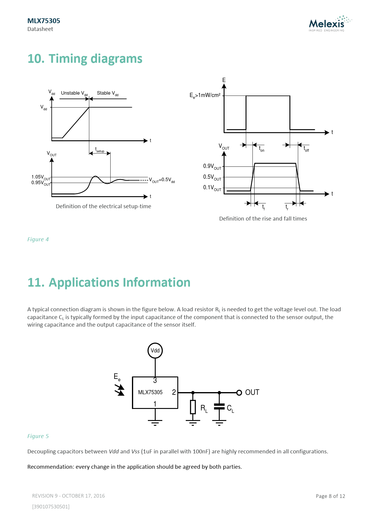 A typical connection diagram is shown in the figure below. A load resistor RL is needed to get the voltage level out. The load capacitance CL is typically formed by the input capacitance of the component that is connected to the sensor output, the wiring capacitance and the output capacitance of the sensor itself. Vdd Ee 3 MLX75305 2 OUT 1 R C L L Figure 5 Decoupling capacitors between Vdd and Vss (1uF in parallel with 100nF) are highly recommended in all configurations. Recommendation: every change in the application should be agreed by both parties. REVISION 9 - OCTOBER 17, 2016 Page 8 of 12 [390107530501]