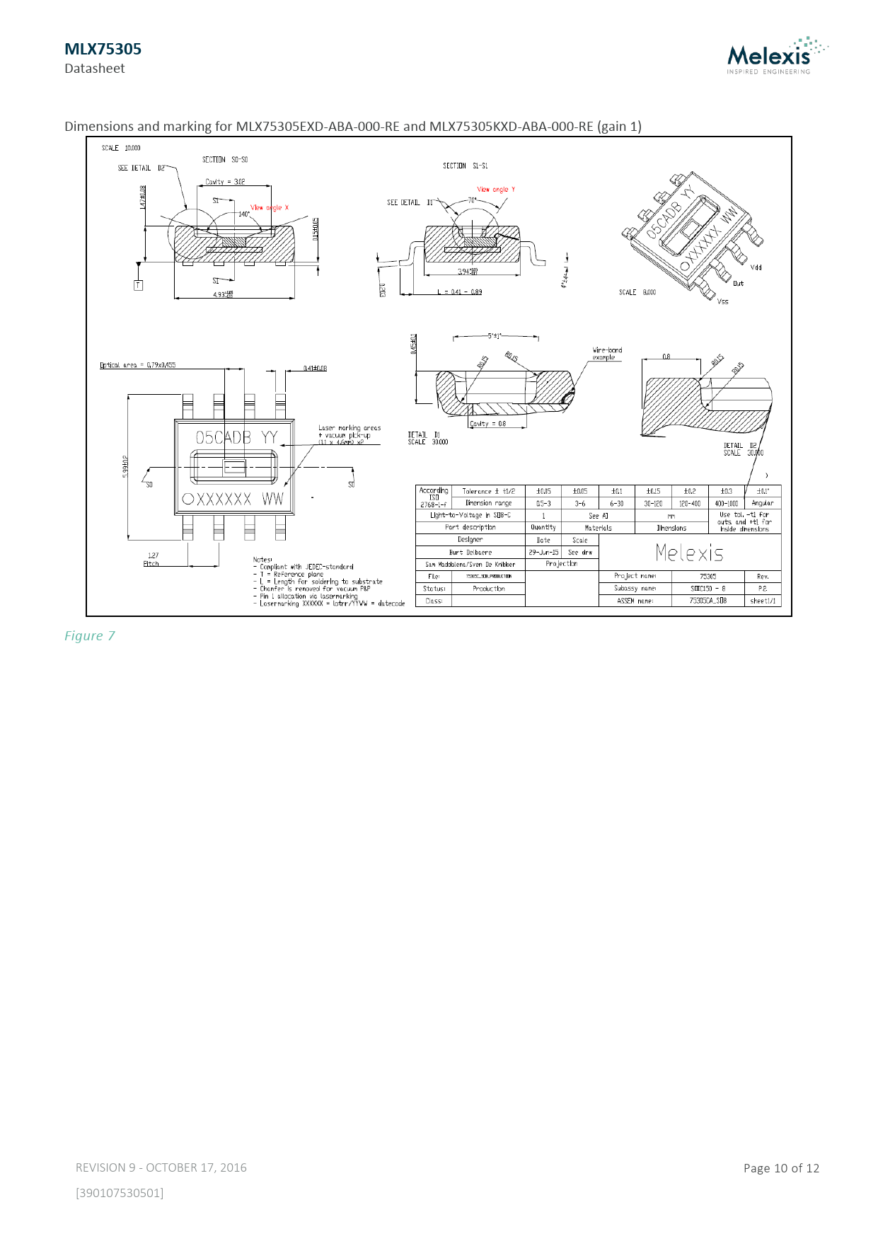 Datasheet Dimensions and marking for MLX75305EXD-ABA-000-RE and MLX75305KXD-ABA-000-RE (gain 1) Figure 7 REVISION 9 - OCTOBER 17, 2016 Page 10 of 12 [390107530501]