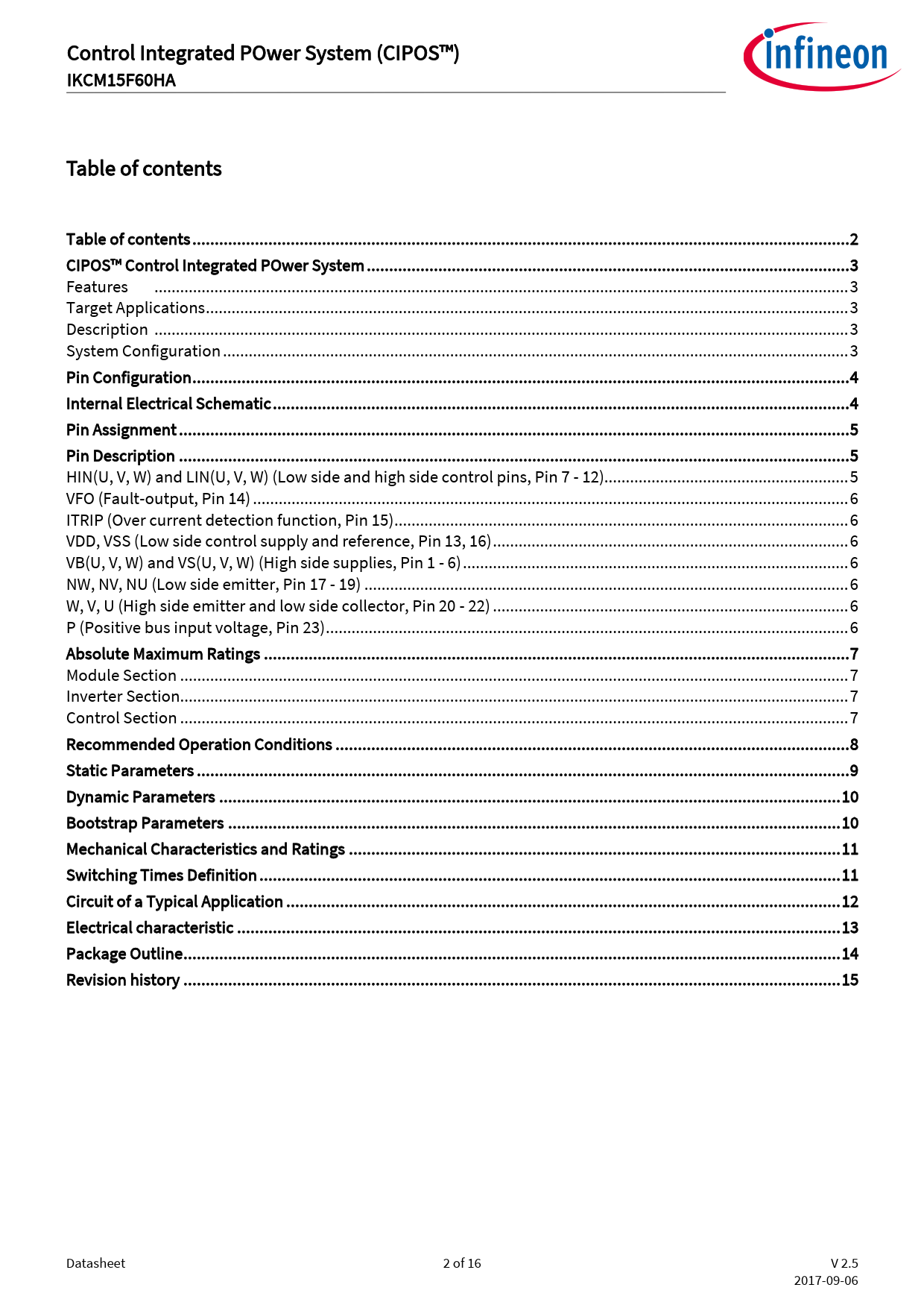 link to page 2 link to page 3 link to page 3 link to page 3 link to page 3 link to page 3 link to page 4 link to page 4 link to page 5 link to page 5 link to page 5 link to page 6 link to page 6 link to page 6 link to page 6 link to page 6 link to page 6 link to page 6 link to page 7 link to page 7 link to page 7 link to page 7 link to page 8 link to page 9 link to page 10 link to page 10 link to page 11 link to page 11 link to page 12 link to page 13 link to page 14 link to page 15 Control Integrated POwer System (CIPOS™) IKCM15F60HA Table of contents Table of contents ... 2 CIPOS™ Control Integrated POwer System .. 3 Features .. 3 Target Applications .. 3 Description .. 3 System Configuration .. 3 Pin Configuration ... 4 Internal Electrical Schematic ... 4 Pin Assignment .. 5 Pin Description .. 5 HIN(U, V, W) and LIN(U, V, W) (Low side and high side control pins, Pin 7 - 12)... 5 VFO (Fault-output, Pin 14) ... 6 ITRIP (Over current detection function, Pin 15) .. 6 VDD, VSS (Low side control supply and reference, Pin 13, 16) ... 6 VB(U, V, W) and VS(U, V, W) (High side supplies, Pin 1 - 6) .. 6 NW, NV, NU (Low side emitter, Pin 17 - 19) ... 6 W, V, U (High side emitter and low side collector, Pin 20 - 22) ... 6 P (Positive bus input voltage, Pin 23) .. 6 Absolute Maximum Ratings ... 7 Module Section .. 7 Inverter Section.. 7 Control Section .. 7 Recommended Operation Conditions ... 8 Static Parameters .. 9 Dynamic Parameters ... 10 Bootstrap Parameters ... 10 Mechanical Characteristics and Ratings .. 11 Switching Times Definition .. 11 Circuit of a Typical Application .. 12 Electrical characteristic ... 13 Package Outline ... 14 Revision history ... 15 Datasheet 2 of 16 V 2.5 2017-09-06 Document Outline Table of contents CIPOS™ Control Integrated POwer System Features Target Applications Description System Configuration Pin Configuration Internal Electrical Schematic Pin Assignment Pin Description HIN(U, V, W) and LIN(U, V, W) (Low side and high side control pins, Pin 7 - 12) VFO (Fault-output, Pin 14) ITRIP (Over current detection function, Pin 15) VDD, VSS (Low side control supply and reference, Pin 13, 16) VB(U, V, W) and VS(U, V, W) (High side supplies, Pin 1 - 6) NW, NV, NU (Low side emitter, Pin 17 - 19) W, V, U (High side emitter and low side collector, Pin 20 - 22) P (Positive bus input voltage, Pin 23) Absolute Maximum Ratings Module Section Inverter Section Control Section Recommended Operation Conditions Static Parameters Dynamic Parameters Bootstrap Parameters Mechanical Characteristics and Ratings Switching Times Definition Circuit of a Typical Application Electrical characteristic Package Outline Revision history
