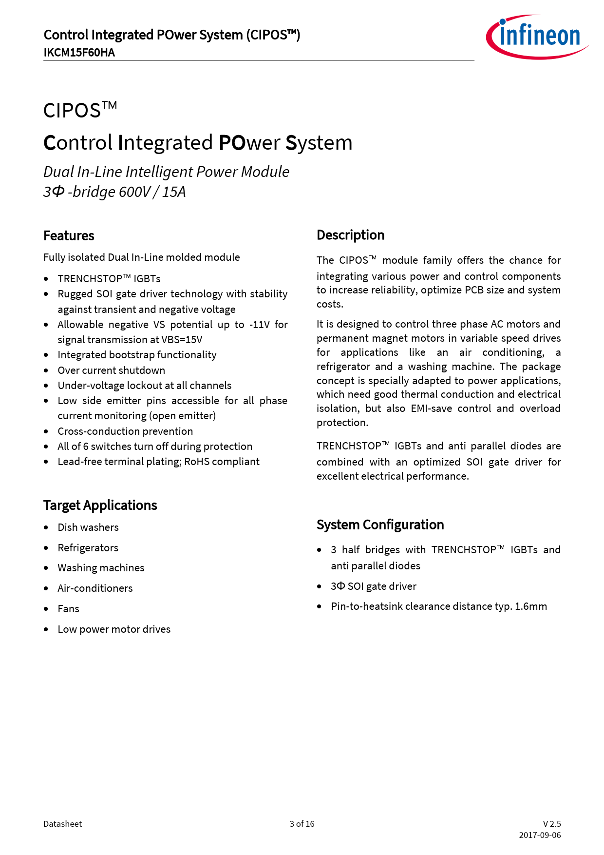 Control Integrated POwer System (CIPOS™) IKCM15F60HA CIPOS™ Control Integrated POwer System Dual In-Line Intelligent Power Module 3Φ