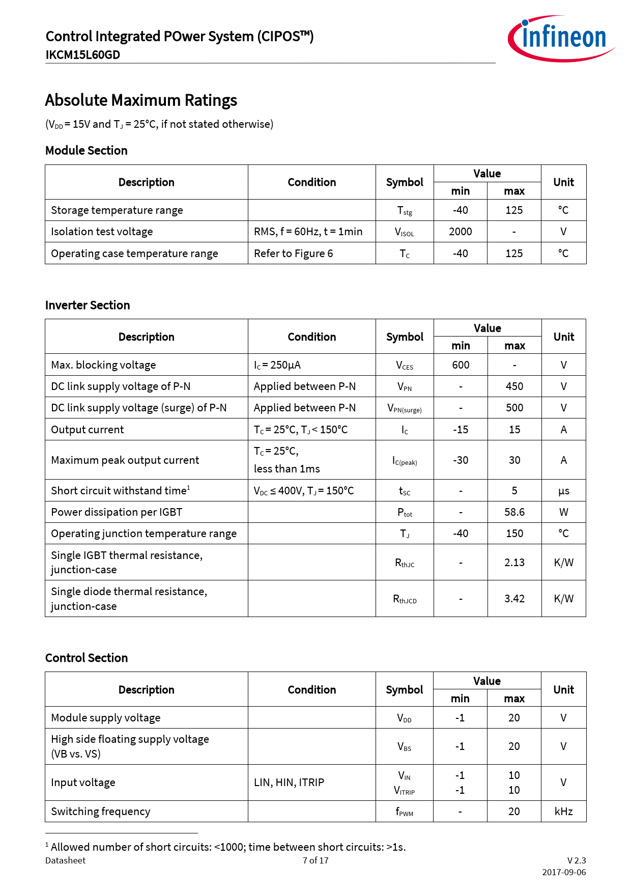 Control Integrated POwer System (CIPOS™) IKCM15L60GD Absolute Maximum Ratings (VDD = 15V and TJ = 25°C, if not stated otherwise) Module Section Value Description Condition Symbol Unit min max Storage temperature range Tstg -40 125 °C Isolation test voltage RMS, f = 60Hz, t = 1min VISOL 2000 - V Operating case temperature range Refer to Figure 6 TC -40 125 °C Inverter Section Value Description Condition Symbol Unit min max Max. blocking voltage IC = 250µA VCES 600 - V DC link supply voltage of P-N Applied between P-N VPN - 450 V DC link supply voltage (surge) of P-N Applied between P-N VPN(surge) - 500 V Output current TC = 25°C, TJ < 150°C IC -15 15 A T Maximum peak output current C = 25°C, I less than 1ms C(peak) -30 30 A Short circuit withstand time1 VDC ≤ 400V, TJ = 150°C tSC - 5 µs Power dissipation per IGBT Ptot - 58.6 W Operating junction temperature range TJ -40 150 °C Single IGBT thermal resistance, R junction-case thJC - 2.13 K/W Single diode thermal resistance, R junction-case thJCD - 3.42 K/W Control Section Value Description Condition Symbol Unit min max Module supply voltage VDD -1 20 V High side floating supply voltage V (VB vs. VS) BS -1 20 V V -1 10 Input voltage LIN, HIN, ITRIP IN V VITRIP -1 10 Switching frequency fPWM - 20 kHz 1 Allowed number of short circuits: <1000; time between short circuits: >1s. Datasheet 7 of 17 V 2.3 2017-09-06 Document Outline Table of contents CIPOS™ Control Integrated POwer System Features Target Applications Description System Configuration Pin Configuration Internal Electrical Schematic Pin Assignment Pin Description HIN(U, V, W) and LIN(U, V, W) (Low side and high side control pins, Pin 7 - 12) VFO (Fault-output and NTC, Pin 14) ITRIP (Over current detection function, Pin 15) VDD, VSS (Low side control supply and reference, Pin 13, 16) VB(U, V, W) and VS(U, V, W) (High side supplies, Pin 1 - 6) NW, NV, NU (Low side emitter, Pin 17 - 19) W, V, U (High side emitter and low side collector, Pin 20 - 22) P (Positive bus input voltage, Pin 23) Absolute Maximum Ratings Module Section Inverter Section Control Section Recommended Operation Conditions Static Parameters Dynamic Parameters Bootstrap Parameters Thermistor Mechanical Characteristics and Ratings Circuit of a Typical Application Switching Times Definition Electrical characteristic Package Outline Revision history