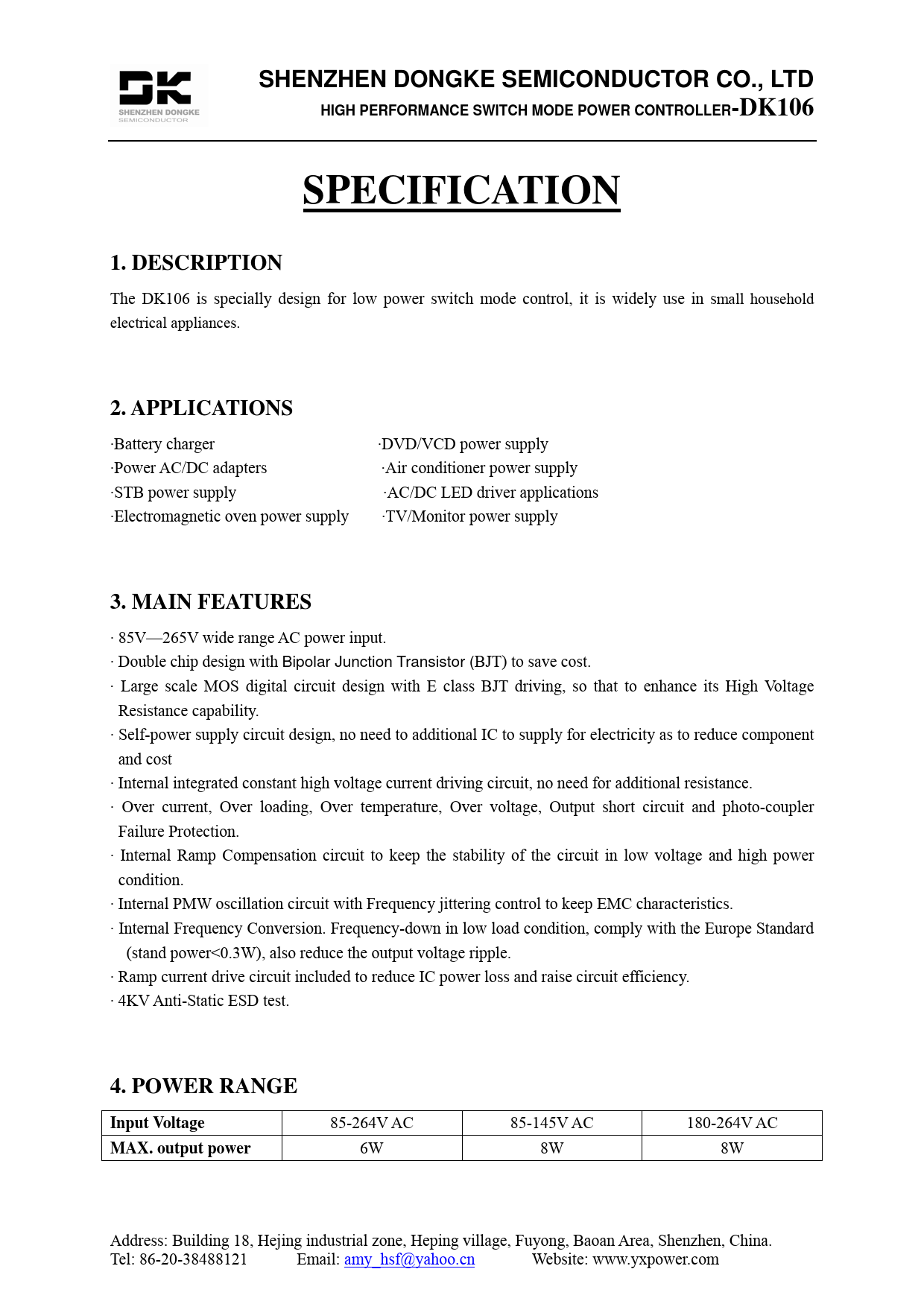 SHENZHEN DONGKE SEMICONDUCTOR CO., LTDHIGH PERFORMANCE SWITCH MODE POWER CONTROLLER-DK106SPECIFICATION1. DESCRIPTION The DK106 is specially design for low power switch mode control, it is widely use in small household electrical appliances. 2. APPLICATIONS ·Battery charger ·DVD/VCD power supply ·Power AC/DC adapters ·Air conditioner power supply ·STB power supply ·AC/DC LED driver applications ·Electromagnetic oven power supply ·TV/Monitor power supply 3. MAIN FEATURES · 85V—265V wide range AC power input. · Double chip design with Bipolar Junction Transistor (BJT) to save cost. · Large scale MOS digital circuit design with E class BJT driving, so that to enhance its High Voltage Resistance capability. · Self-power supply circuit design, no need to additional IC to supply for electricity as to reduce component and cost · Internal integrated constant high voltage current driving circuit, no need for additional resistance. · Over current, Over loading, Over temperature, Over voltage, Output short circuit and photo-coupler Failure Protection. · Internal Ramp Compensation circuit to keep the stability of the circuit in low voltage and high power condition. · Internal PMW oscillation circuit with Frequency jittering control to keep EMC characteristics. · Internal Frequency Conversion. Frequency-down in low load condition, comply with the Europe Standard (stand power<0.3W), also reduce the output voltage ripple. · Ramp current drive circuit included to reduce IC power loss and raise circuit efficiency. · 4KV Anti-Static ESD test. 4. POWER RANGEInput Voltage 85-264V AC 85-145V AC 180-264V AC MAX. output power 6W 8W 8W Address: Building 18, Hejing industrial zone, Heping village, Fuyong, Baoan Area, Shenzhen, China. Tel: 86-20-38488121 Email: amy_hsf@yahoo.cn Website: www.yxpower.com