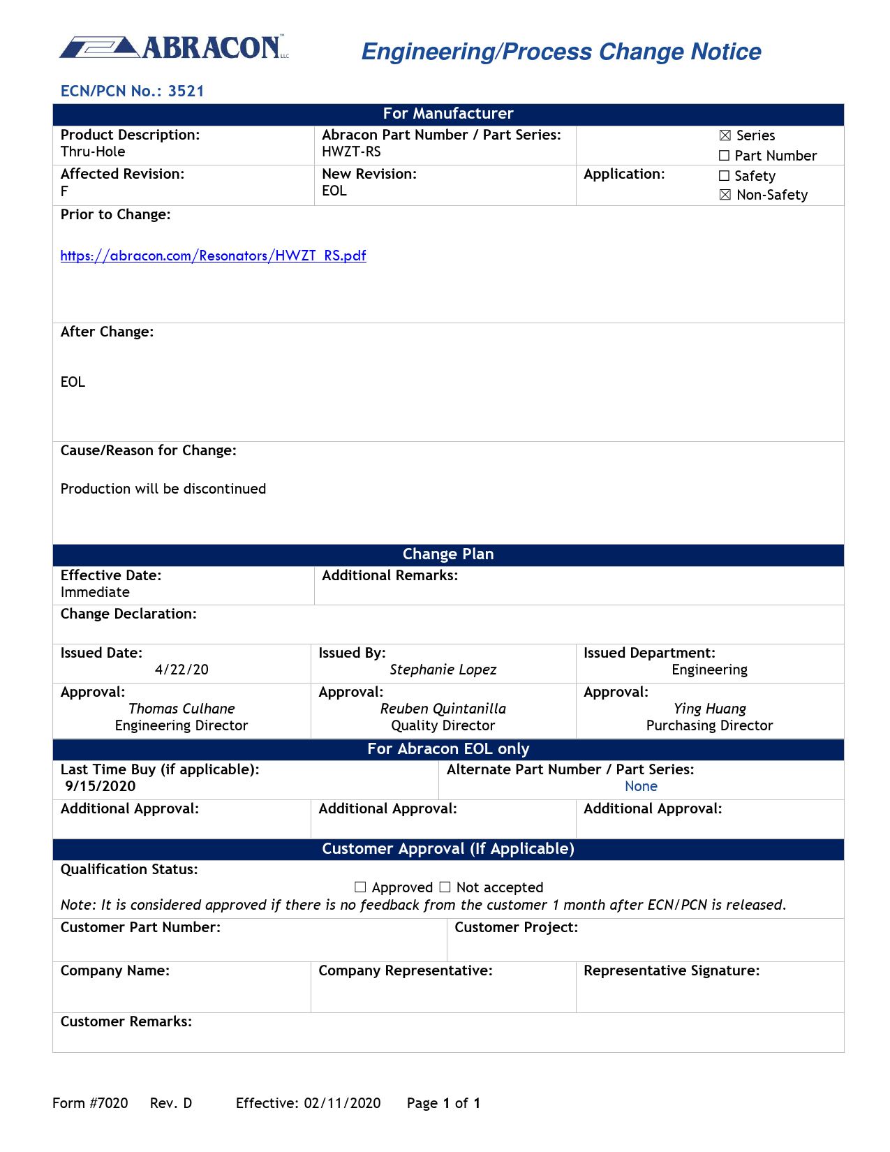 Engineering/Process Change Notice ECN/PCN No.: 3521 For Manufacturer Product Description: Abracon Part Number / Part Series: