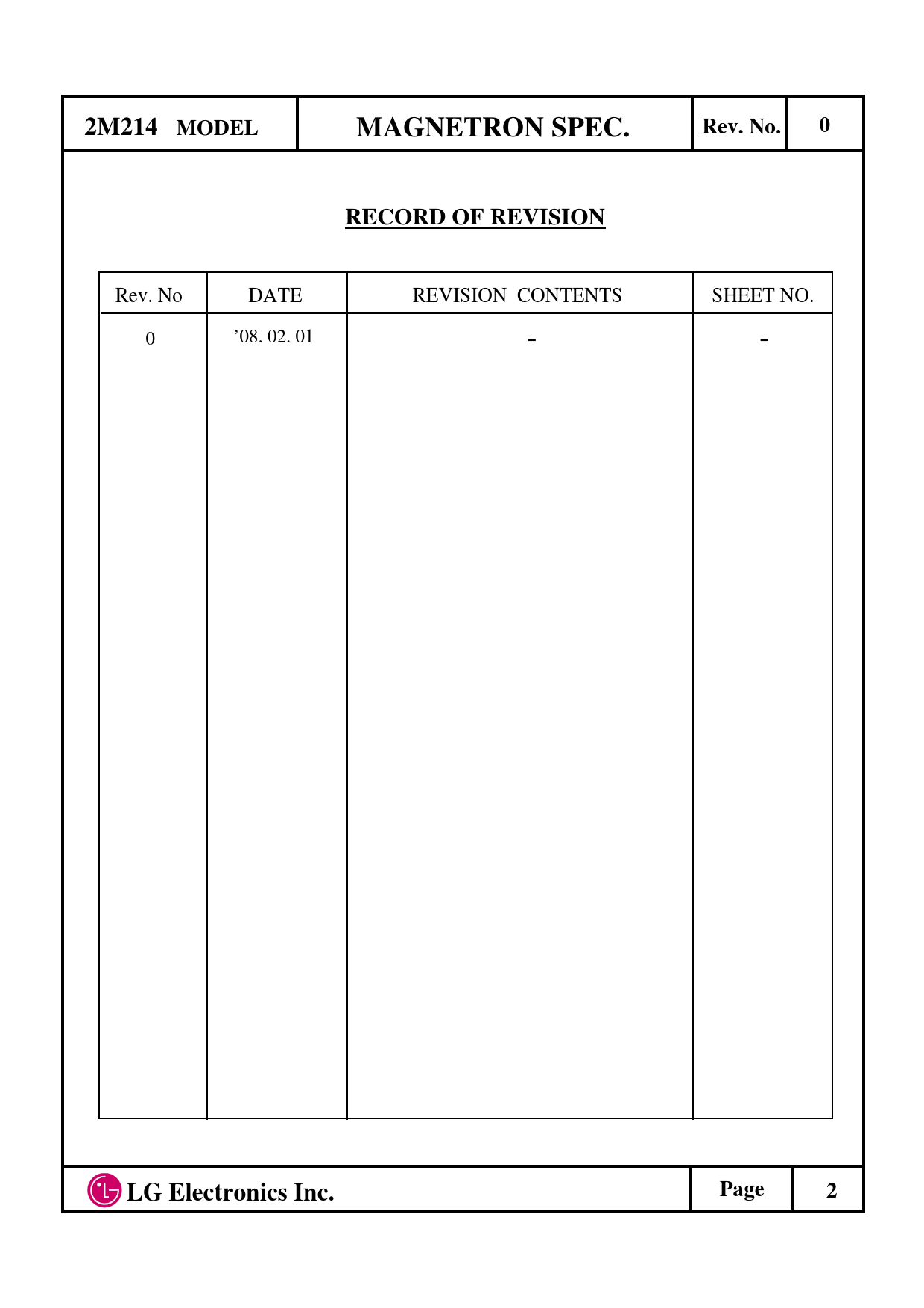 2M214 MODEL. MAGNETRON SPEC. Rev. No. RECORD OF REVISION. Page. LG Electronics Inc