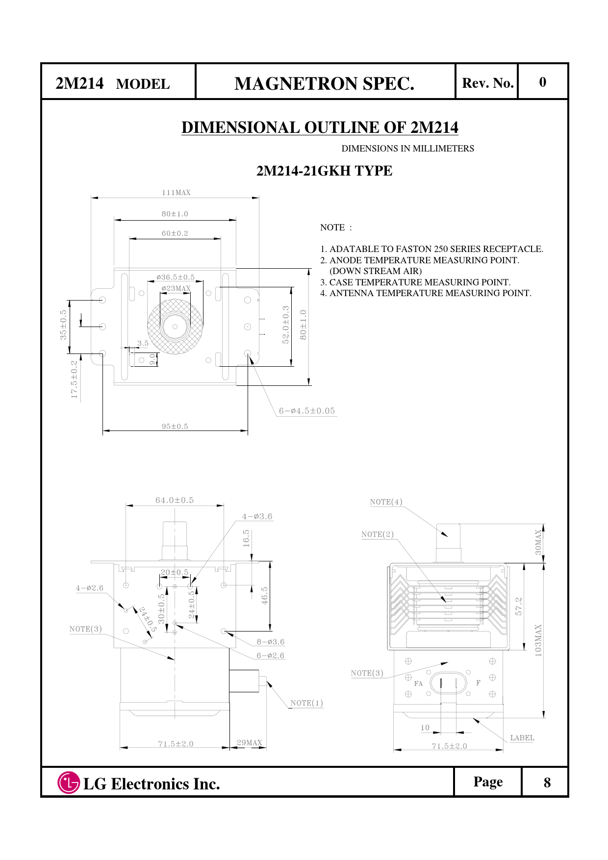 2M214 MODEL. MAGNETRON SPEC. Rev. No. DIMENSIONAL OUTLINE OF 2M214. 2M214-21GKH TYPE. Page. LG Electronics Inc
