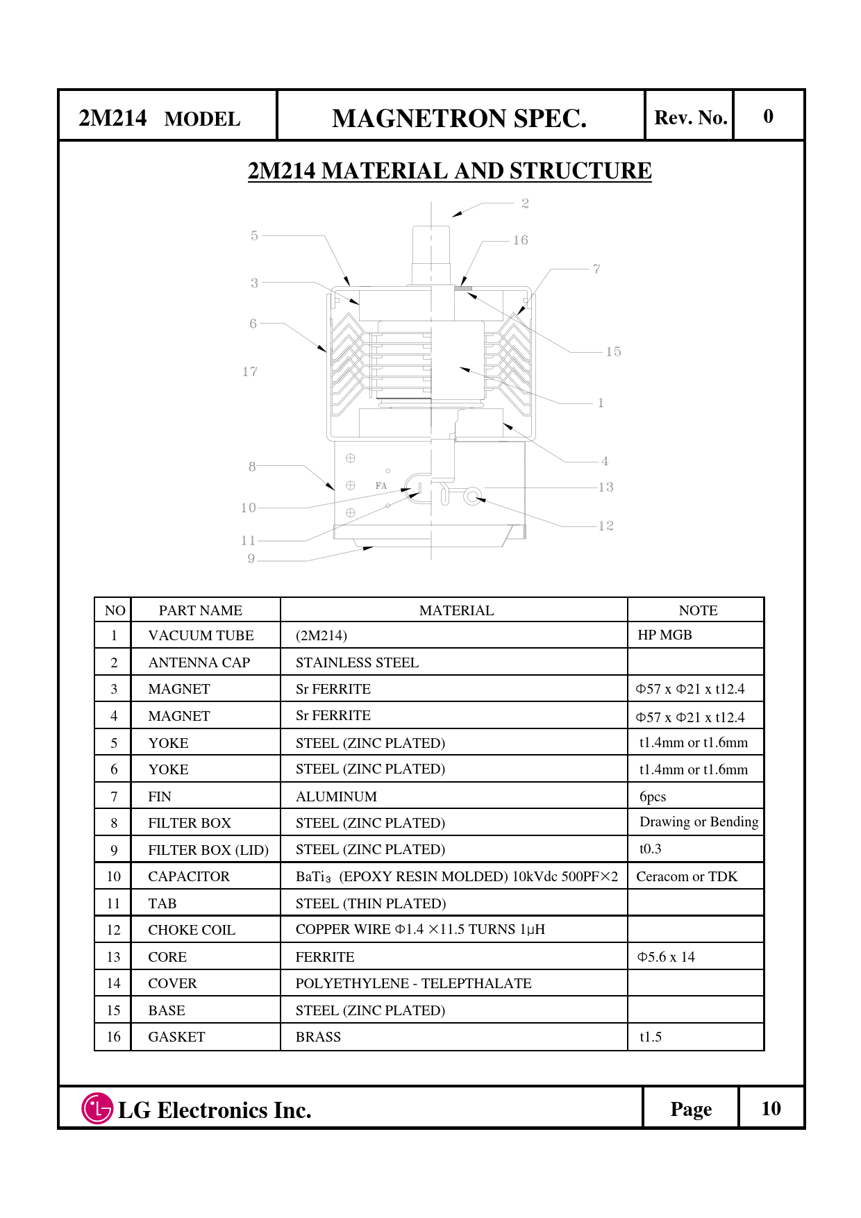 2M214 MODEL. MAGNETRON SPEC. Rev. No. 2M214 MATERIAL AND STRUCTURE. LG Electronics Inc. Page
