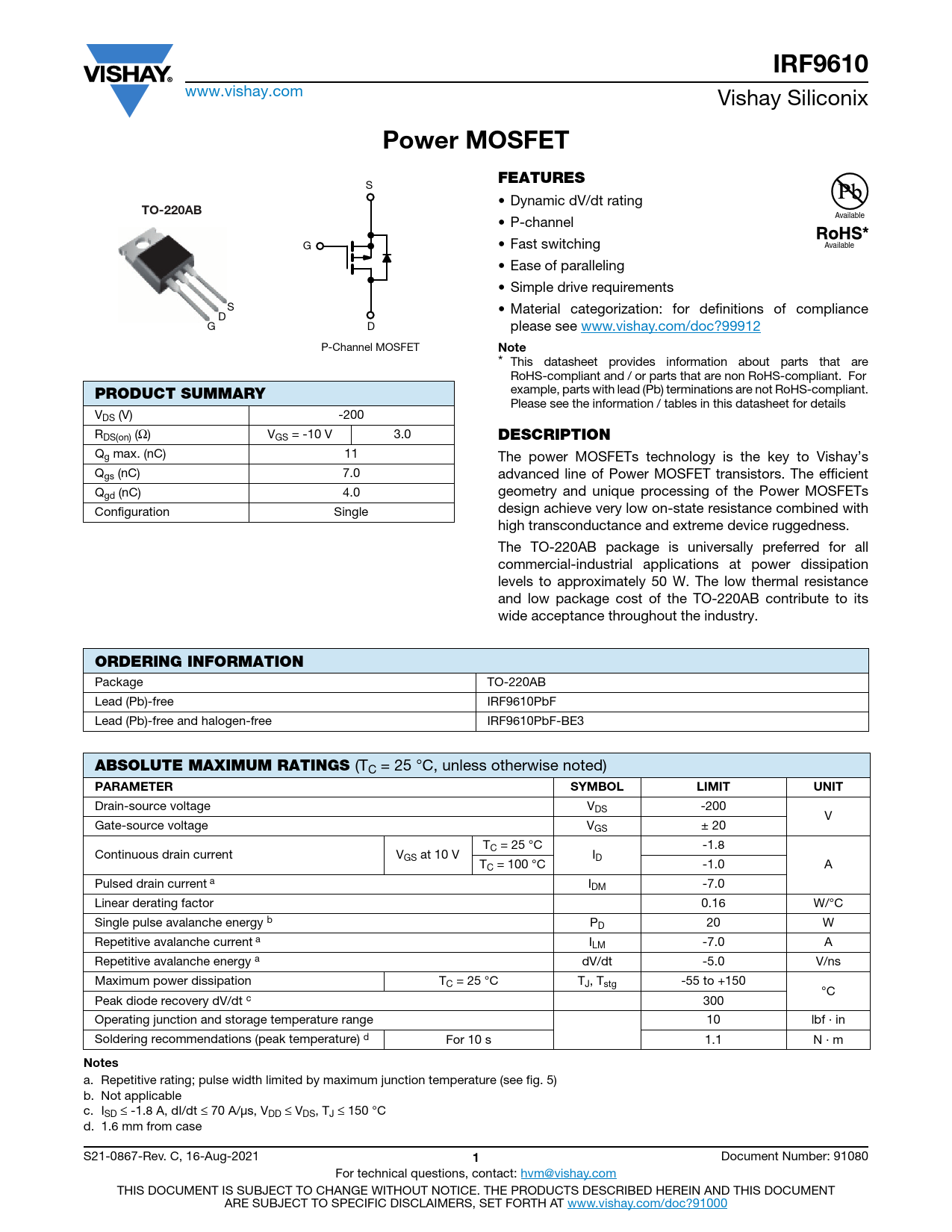 IRF9610 www.vishay.com Vishay Siliconix Power MOSFETFEATURES S • Dynamic dV/dt rating TO-220AB Available • P-channel G • Fast switching Available • Ease of paralleling • Simple drive requirements S • Material categorization: for definitions of compliance D G D please see www.vishay.com/doc?99912 P-Channel MOSFET Note * This datasheet provides information about parts that are RoHS-compliant and / or parts that are non RoHS-compliant. For example, parts with lead (Pb) terminations are not RoHS-compliant. PRODUCT SUMMARY Please see the information / tables in this datasheet for details VDS (V) -200 RDS(on) (Ω) VGS = -10 V 3.0 DESCRIPTION Qg max. (nC) 11 The power MOSFETs technology is the key to Vishay’s Qgs (nC) 7.0 advanced line of Power MOSFET transistors. The efficient Q geometry and unique processing of the Power MOSFETs gd (nC) 4.0 design achieve very low on-state resistance combined with Configuration Single high transconductance and extreme device ruggedness. The TO-220AB package is universally preferred for all commercial-industrial applications at power dissipation levels to approximately 50 W. The low thermal resistance and low package cost of the TO-220AB contribute to its wide acceptance throughout the industry. ORDERING INFORMATION Package TO-220AB Lead (Pb)-free IRF9610PbF Lead (Pb)-free and halogen-free IRF9610PbF-BE3 ABSOLUTE MAXIMUM RATINGS (TC = 25 °C, unless otherwise noted) PARAMETER SYMBOLLIMITUNIT Drain-source voltage VDS -200 V Gate-source voltage VGS ± 20 TC = 25 °C -1.8 Continuous drain current VGS at 10 V ID TC = 100 °C -1.0 A Pulsed drain current a IDM -7.0 Linear derating factor 0.16 W/°C Single pulse avalanche energy b PD 20 W Repetitive avalanche current a ILM -7.0 A Repetitive avalanche energy a dV/dt -5.0 V/ns Maximum power dissipation TC = 25 °C TJ, Tstg -55 to +150 °C Peak diode recovery dV/dt c 300 Operating junction and storage temperature range 10 lbf · in Soldering recommendations (peak temperature) d For 10 s 1.1 N · m Notes a. Repetitive rating; pulse width limited by maximum junction temperature (see fig. 5) b. Not applicable c. ISD ≤ -1.8 A, dI/dt ≤ 70 A/μs, VDD ≤ VDS, TJ ≤ 150 °C d. 1.6 mm from case S21-0867-Rev. C, 16-Aug-2021 1 Document Number: 91080 For technical questions, contact: hvm@vishay.com THIS DOCUMENT IS SUBJECT TO CHANGE WITHOUT NOTICE. THE PRODUCTS DESCRIBED HEREIN AND THIS DOCUMENT ARE SUBJECT TO SPECIFIC DISCLAIMERS, SET FORTH AT www.vishay.com/doc?91000