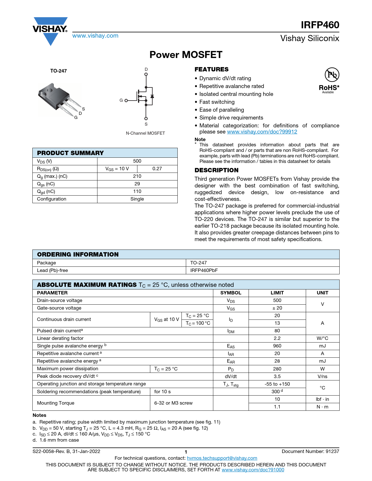 IRFP460. Power MOSFET. TO-247. FEATURES. Note. PRODUCT SUMMARY. DESCRIPTION. ORDERING INFORMATION. ABSOLUTE MAXIMUM RATINGS