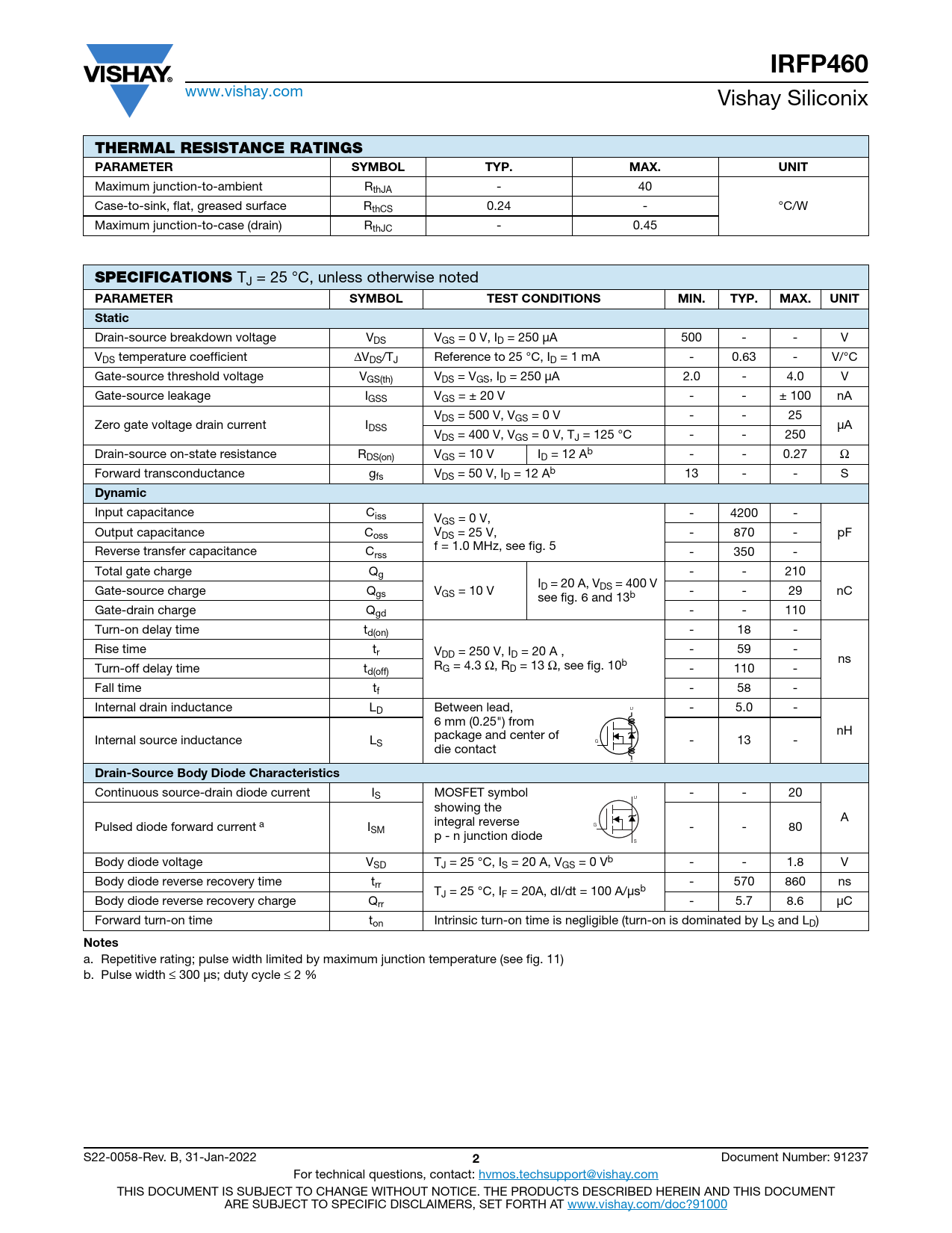 IRFP460 www.vishay.com Vishay Siliconix THERMAL RESISTANCE RATINGS PARAMETER SYMBOLTYP.MAX.UNIT Maximum junction-to-ambient RthJA - 40 Case-to-sink, flat, greased surface RthCS 0.24 - °C/W Maximum junction-to-case (drain) RthJC - 0.45 SPECIFICATIONS TJ = 25 °C, unless otherwise noted PARAMETER SYMBOLTESTCONDITIONSMIN.TYP.MAX.UNITStatic Drain-source breakdown voltage VDS VGS = 0 V, ID = 250 μA 500 - - V VDS temperature coefficient ΔVDS/TJ Reference to 25 °C, ID = 1 mA - 0.63 - V/°C Gate-source threshold voltage VGS(th) VDS = VGS, ID = 250 μA 2.0 - 4.0 V Gate-source leakage IGSS VGS = ± 20 V - - ± 100 nA VDS = 500 V, VGS = 0 V - - 25 Zero gate voltage drain current IDSS μA VDS = 400 V, VGS = 0 V, TJ = 125 °C - - 250 Drain-source on-state resistance RDS(on) VGS = 10 V ID = 12 Ab - - 0.27 Ω Forward transconductance gfs VDS = 50 V, ID = 12 Ab 13 - - S Dynamic Input capacitance Ciss V - 4200 - GS = 0 V, Output capacitance Coss VDS = 25 V, - 870 - pF f = 1.0 MHz, see fig. 5 Reverse transfer capacitance Crss - 350 - Total gate charge Qg - - 210 I Gate-source charge Qgs V D = 20 A, VDS = 400 V GS = 10 V - - 29 nC see fig. 6 and 13b Gate-drain charge Qgd - - 110 Turn-on delay time td(on) - 18 - Rise time tr V - 59 - DD = 250 V, ID = 20 A , ns R Turn-off delay time t G = 4.3 Ω, RD = 13 Ω, see fig. 10b d(off) - 110 - Fall time tf - 58 - Internal drain inductance LD Between lead, D - 5.0 - 6 mm (0.25") from package and center of nH Internal source inductance LS G - 13 - die contact S Drain-Source Body Diode Characteristics Continuous source-drain diode current IS MOSFET symbol - - 20 D showing the integral reverse A Pulsed diode forward current a I G SM - - 80 p - n junction diode S Body diode voltage VSD TJ = 25 °C, IS = 20 A, VGS = 0 Vb - - 1.8 V Body diode reverse recovery time trr - 570 860 ns TJ = 25 °C, IF = 20A, dI/dt = 100 A/μsb Body diode reverse recovery charge Qrr - 5.7 8.6 μC Forward turn-on time ton Intrinsic turn-on time is negligible (turn-on is dominated by LS and LD) Notes a. Repetitive rating; pulse width limited by maximum junction temperature (see fig. 11) b. Pulse width ≤ 300 μs; duty cycle ≤ 2 % S22-0058-Rev. B, 31-Jan-2022 2 Document Number: 91237 For technical questions, contact: hvmos.techsupport@vishay.com THIS DOCUMENT IS SUBJECT TO CHANGE WITHOUT NOTICE. THE PRODUCTS DESCRIBED HEREIN AND THIS DOCUMENT ARE SUBJECT TO SPECIFIC DISCLAIMERS, SET FORTH AT www.vishay.com/doc?91000
