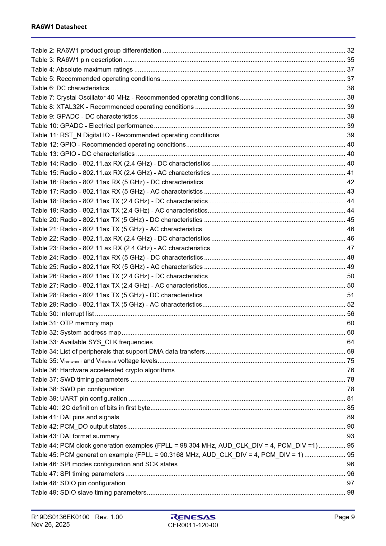 Table 2: RA6W1 product group differentiation .. 32 Table 3: RA6W1 pin description .. 35 Table 4: Absolute maximum ratings .. 37 Table 5: Recommended operating conditions ... 37 Table 6: DC characteristics .. 38 Table 7: Crystal Oscillator 40 MHz - Recommended operating conditions ... 38 Table 8: XTAL32K - Recommended operating conditions .. 39 Table 9: GPADC - DC characteristics ... 39 Table 10: GPADC - Electrical performance ... 39 Table 11: RST_N Digital IO - Recommended operating conditions .. 39 Table 12: GPIO - Recommended operating conditions ... 40 Table 13: GPIO - DC characteristics ... 40 Table 14: Radio - 802.11.ax RX (2.4 GHz) - DC characteristics ... 40 Table 15: Radio - 802.11.ax RX (2.4 GHz) - AC characteristics ... 41 Table 16: Radio - 802.11ax RX (5 GHz) - DC characteristics ... 42 Table 17: Radio - 802.11ax RX (5 GHz) - AC characteristics ... 43 Table 18: Radio - 802.11ax TX (2.4 GHz) - DC characteristics .. 44 Table 19: Radio - 802.11ax TX (2.4 GHz) - AC characteristics ... 44 Table 20: Radio - 802.11ax TX (5 GHz) - DC characteristics ... 45 Table 21: Radio - 802.11ax TX (5 GHz) - AC characteristics .. 46 Table 22: Radio - 802.11.ax RX (2.4 GHz) - DC characteristics ... 46 Table 23: Radio - 802.11.ax RX (2.4 GHz) - AC characteristics ... 47 Table 24: Radio - 802.11ax RX (5 GHz) - DC characteristics ... 48 Table 25: Radio - 802.11ax RX (5 GHz) - AC characteristics ... 49 Table 26: Radio - 802.11ax TX (2.4 GHz) - DC characteristics .. 50 Table 27: Radio - 802.11ax TX (2.4 GHz) - AC characteristics ... 50 Table 28: Radio - 802.11ax TX (5 GHz) - DC characteristics ... 51 Table 29: Radio - 802.11ax TX (5 GHz) - AC characteristics .. 52 Table 30: Interrupt list .. 56 Table 31: OTP memory map ... 60 Table 32: System address map ... 60 Table 33: Available SYS_CLK frequencies ... 64 Table 34: List of peripherals that support DMA data transfers .. 69 Table 35: Vbrownout and Vblackout voltage levels ... 75 Table 36: Hardware accelerated crypto algorithms ... 76 Table 37: SWD timing parameters .. 78 Table 38: SWD pin configuration ... 78 Table 39: UART pin configuration ... 81 Table 40: I2C definition of bits in first byte ... 85 Table 41: DAI pins and signals .. 89 Table 42: PCM_DO output states .. 90 Table 43: DAI format summary .. 93 Table 44: PCM clock generation examples (FPLL = 98.304 MHz, AUD_CLK_DIV = 4, PCM_DIV =1) ... 95 Table 45: PCM generation example (FPLL = 90.3168 MHz, AUD_CLK_DIV = 4, PCM_DIV = 1) ... 95 Table 46: SPI modes configuration and SCK states ... 96 Table 47: SPI timing parameters ... 96 Table 48: SDIO pin configuration .. 97 Table 49: SDIO slave timing parameters ... 98 R19DS0136EK0100 Rev. 1.00 Page 9 Nov 26, 2025 CFR0011-120-00 Document Outline Features Applications Contents Figures Tables 1. Terms and Definitions 2. Block Diagrams 3. Part Numbering 4. RA6W1 Product Group 5. Pin Information 5.1 FCQFN Pinout 5.2 WLCSP Pinout 5.3 Pin Descriptions 6. Specifications 6.1 Absolute Maximum Ratings 6.2 Recommended Operating Conditions 6.3 DC Characteristics 6.4 Crystal Oscillator 40 MHz – Recommended Operating Conditions 6.5 XTAL32K – Recommended Operating Conditions 6.6 GPADC – DC Characteristics 6.7 GPADC – Electrical Performance 6.8 RST_N Digital I/O – Recommended Operating Conditions 6.9 GPIO – Recommended Operating Conditions 6.10 GPIO – DC Characteristics 6.11 Radio 6.11.1 wlCSP Package WLAN Radio Characteristics 6.11.2 QFN Package WLAN Radio Characteristics 7. System Overview 8. Core System 8.1 Arm Cortex-M33 8.1.1 Introduction 8.1.2 Interrupts 8.1.3 Debug 8.2 Internal Memory Architecture 8.2.1 Introduction 8.2.2 ROM 8.2.3 System RAM 8.2.4 Retention RAM 8.2.5 OTP 8.2.6 System Address Map 8.3 Clock Generation 8.3.1 Introduction 8.3.2 System Clock (SYS_CLK, HCLK) 8.3.3 Peripheral Clocks (SPI_CLK, PERI_CLK, AUX_CLK) 8.3.4 Audio Clocks (AUD_CLK) 8.3.5 RTC Clocks (32 kHz) 8.4 Power Management 8.4.1 Power-On Sequence 8.4.2 Power Management Unit 8.5 Sleep Modes 8.5.1 Introduction 8.5.2 Wake-Up Sources 8.5.3 Sleep Mode Active Blocks Overview 8.6 DMA 8.6.1 Introduction 8.6.2 General Purpose DMA 8.6.2.1 Input/Output Multiplexer 8.6.2.2 DMA Channel Operation 8.6.2.3 DMA Arbitration 8.6.2.4 Freezing DMA Channels 8.6.3 Fast DMA 8.7 Hardware Accelerators 8.7.1 CRC Calculation 8.7.2 Pseudo Random Number Generation 8.8 Watchdog Timer 8.8.1 Introduction 8.9 Brownout and Blackout Detection 8.10 Security Features 8.10.1 Crypto Engine 8.11 Debug Support 9. Peripherals 9.1 UART 9.1.1 Introduction 9.1.2 RS-232 9.1.3 RS-485 9.1.4 Baud Rate 9.1.5 Hardware Flow Control 9.1.6 Interrupts 9.1.7 DMA Interface 9.1.8 Pin Configuration 9.2 I2C Interface 9.2.1 Introduction 9.2.2 I2C Behavior 9.2.2.1 START and STOP Generation 9.2.2.2 Combined Formats 9.2.3 I2C Protocols 9.2.3.1 START and STOP Conditions 9.2.3.2 Addressing Slave Protocol 9.2.3.2.1 7-bit Address Format 9.2.3.2.2 10-bit Address Format 9.2.3.3 Transmitting and Receiving Protocols 9.2.3.3.1 Master-Transmitter and Slave-Receiver 9.2.3.3.2 Master-Receiver and Slave-Transmitter 9.2.3.3.3 START Byte Transfer Protocol 9.2.4 Multiple Master Arbitration 9.2.5 Clock Synchronization 9.3 Digital Audio Interface (I2S and PDM) 9.3.1 Introduction 9.3.2 Interface Signals 9.3.3 Master and Slave Modes 9.3.4 DAI Slots 9.3.5 DAI Slot Formats 9.3.5.1 I2S Format 9.3.5.2 DSP Format 9.3.5.3 Left-Justified Format 9.3.5.4 Right-Justified Format 9.3.5.5 Time Division Multiplexing Mode 9.3.6 DAI Slot Assignment 9.3.7 DAI PCM_CLK Generation 9.4 SPI Master/Slave 9.4.1 Introduction 9.4.2 SPI Timing 9.5 SDIO 9.5.1 Introduction 9.6 SD/eMMC Host Controller 9.6.1 Introduction 9.7 Octa/Quad SPI Flash Controller – With Secure XIP 9.7.1 Introduction 9.7.1.1 Interface 9.7.1.2 SPI Modes 9.7.1.3 Access Modes 9.7.1.3.1 Auto Mode 9.7.1.3.2 Manual Mode 9.7.1.4 Endianness 9.7.1.5 Erase Suspend/Resume 9.7.1.6 On-the-fly Decryption 9.8 Quad SPI RAM/Flash Controller – PSRAM 9.8.1 Introduction 9.8.2 Interface 9.8.3 SPI Modes 9.8.4 Access Modes 9.8.4.1 Au