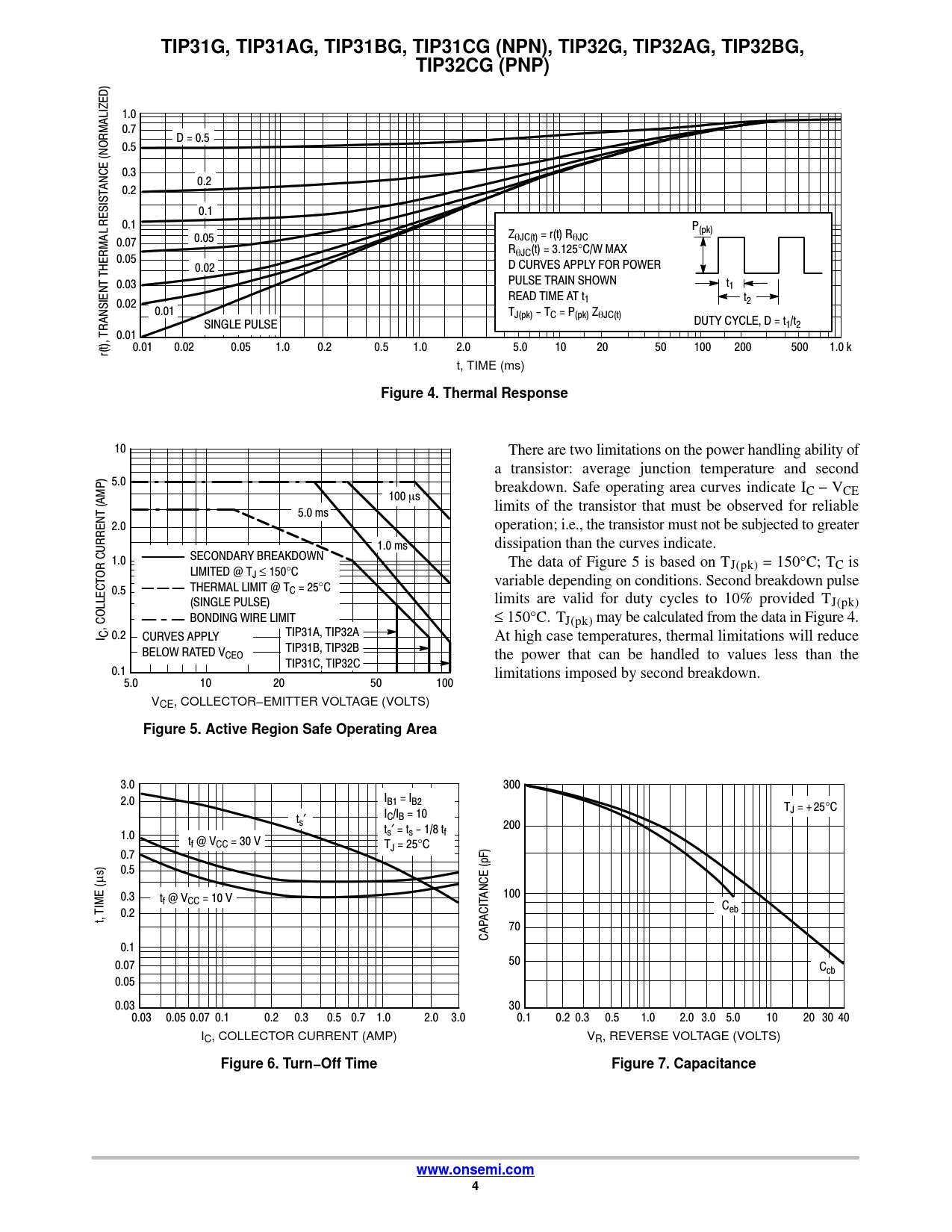 link to page 4 link to page 4 TIP31G, TIP31AG, TIP31BG, TIP31CG (NPN), TIP32G, TIP32AG, TIP32BG,TIP32CG (PNP) 1.0 0.7 D = 0.5 0.5 (NORMALIZED) 0.3 ANCE 0.2 0.2 0.1 RESIST 0.1 P Z (pk) 0.05 qJC(t) = r(t) RqJC 0.07 RqJC(t) = 3.125°C/W MAX 0.05 D CURVES APPLY FOR POWER 0.02 THERMAL PULSE TRAIN SHOWN 0.03 t1 READ TIME AT t1 t2 0.02 0.01 TJ(pk) - TC = P(pk) ZqJC(t) SINGLE PULSE DUTY CYCLE, D = t1/t2 0.01 , TRANSIENT 0.01 r(t) 0.02 0.05 1.0 0.2 0.5 1.0 2.0 5.0 10 20 50 100 200 500 1.0 k t, TIME (ms) Figure 4. Thermal Response 10 There are two limitations on the power handling ability of a transistor: average junction temperature and second 5.0 breakdown. Safe operating area curves indicate I 100ms C − VCE (AMP) limits of the transistor that must be observed for reliable 5.0ms 2.0 operation; i.e., the transistor must not be subjected to greater 1.0ms dissipation than the curves indicate. SECONDARY BREAKDOWN 1.0 The data of Figure 5 is based on TJ(pk) = 150°C; TC is OR CURRENT LIMITED @ TJ ≤ 150°C variable depending on conditions. Second breakdown pulse 0.5 THERMAL LIMIT @ TC = 25°C (SINGLE PULSE) limits are valid for duty cycles to 10% provided TJ(pk) BONDING WIRE LIMIT ≤ 150°C. T , COLLECT J(pk) may be calculated from the data in Figure 4. I C 0.2 CURVES APPLY TIP31A, TIP32A At high case temperatures, thermal limitations will reduce BELOW RATED V TIP31B, TIP32B CEO the power that can be handled to values less than the TIP31C, TIP32C 0.1 limitations imposed by second breakdown. 5.0 10 20 50 100 VCE, COLLECTOR−EMITTER VOLTAGE (VOLTS) Figure 5. Active Region Safe Operating Area 3.0 300 2.0 IB1 = IB2 TJ = +25°C t IC/IB = 10 s′ 200 t 1.0 s′ = ts - 1/8 tf tf @ VCC = 30 V TJ = 25°C 0.7 0.5 (s)μ 0.3 ANCE (pF) 100 tf @ VCC = 10 V Ceb t, TIME 0.2 ACIT 70 CAP 0.1 0.07 50 Ccb 0.05 0.03 30 0.03 0.05 0.07 0.1 0.2 0.3 0.5 0.7 1.0 2.0 3.0 0.1 0.2 0.3 0.5 1.0 2.0 3.0 5.0 10 20 30 40 IC, COLLECTOR CURRENT (AMP) VR, REVERSE VOLTAGE (VOLTS) Figure 6. Turn−Off TimeFigure 7. Capacitancewww.onsemi.com4