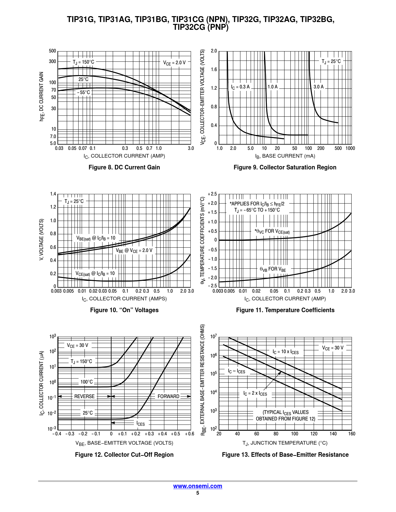 TIP31G, TIP31AG, TIP31BG, TIP31CG (NPN), TIP32G, TIP32AG, TIP32BG,. TIP32CG (PNP). Figure 8. DC Current Gain