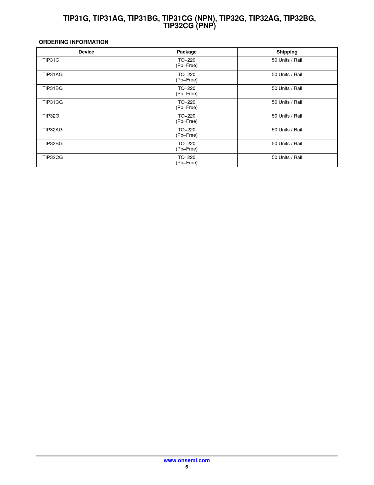 TIP31G TO−220 50 Units / Rail (Pb−Free) TIP31AG TO−220 50 Units / Rail (Pb−Free) TIP31BG TO−220 50 Units / Rail (Pb−Free) TIP31CG TO−220 50 Units / Rail (Pb−Free) TIP32G TO−220 50 Units / Rail (Pb−Free) TIP32AG TO−220 50 Units / Rail (Pb−Free) TIP32BG TO−220 50 Units / Rail (Pb−Free) TIP32CG TO−220 50 Units / Rail (Pb−Free)