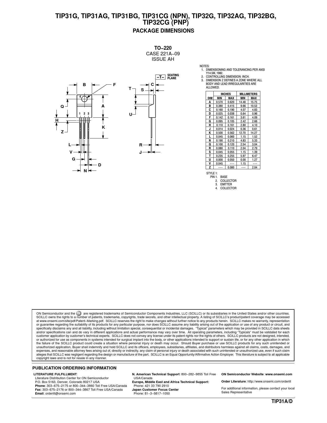 TIP31G, TIP31AG, TIP31BG, TIP31CG (NPN), TIP32G, TIP32AG, TIP32BG,TIP32CG (PNP)PACKAGE DIMENSIONSTO−220 CASE 221A−09 ISSUE AH NOTES: 1. DIMENSIONING AND TOLERANCING PER ANSI Y14.5M, 1982. SEATING 2. CONTROLLING DIMENSION: INCH. −T− PLANE 3. DIMENSION Z DEFINES A ZONE WHERE ALL BODY AND LEAD IRREGULARITIES ARE BFC ALLOWED. TSINCHESMILLIMETERS4DIMMINMAXMINMAXA 0.570 0.620 14.48 15.75 AB 0.380 0.415 9.66 10.53 QC 0.160 0.190 4.07 4.83 12 3D 0.025 0.038 0.64 0.96 UF 0.142 0.161 3.61 4.09 HG 0.095 0.105 2.42 2.66 H 0.110 0.161 2.80 4.10 KJ 0.014 0.024 0.36 0.61 ZK 0.500 0.562 12.70 14.27 L 0.045 0.060 1.15 1.52 N 0.190 0.210 4.83 5.33 Q 0.100 0.120 2.54 3.04 LRR 0.080 0.110 2.04 2.79 VS 0.045 0.055 1.15 1.39 JT 0.235 0.255 5.97 6.47 GU 0.000 0.050 0.00 1.27 V 0.045 --- 1.15 --- DZ --- 0.080 --- 2.04 N STYLE 1: PIN 1. BASE 2. COLLECTOR 3. EMITTER 4. COLLECTOR ON Semiconductor and the are registered trademarks of Semiconductor Components Industries, LLC (SCILLC) or its subsidiaries in the United States and/or other countries. SCILLC owns the rights to a number of patents, trademarks, copyrights, trade secrets, and other intellectual property. A listing of SCILLC’s product/patent coverage may be accessed at www.onsemi.com/site/pdf/Patent−Marking.pdf. SCILLC reserves the right to make changes without further notice to any products herein. SCILLC makes no warranty, representation or guarantee regarding the suitability of its products for any particular purpose, nor does SCILLC assume any liability arising out of the application or use of any product or circuit, and specifically disclaims any and all liability, including without limitation special, consequential or incidental damages. “Typical” parameters which may be provided in SCILLC data sheets and/or specifications can and do vary in different applications and actual performance may vary over time. All operating parameters, including “Typicals” must be validated for each customer application by customer’s technical experts. SCILLC does not convey any license under its patent rights nor the rights of others. SCILLC products are not designed, intended, or authorized for use as components in systems intended for surgical implant into the body, or other applications intended to support or sustain life, or for any other application in which the failure of the SCILLC product could create a situation where personal injury or death may occur. Should Buyer purchase or use SCILLC products for any such unintended or unauthorized application, Buyer shall indemnify and hold SCILLC and its officers, employees, subsidiaries, affiliates, and distributors harmless against all claims, costs, damages, and expenses, and reasonable attorney fees arising out of, directly or indirectly, any claim of personal injury or death associated with such unintended or unauthorized use, even if such claim alleges that SCILLC was negligent regarding the design or manufacture of the part. SCILLC is an Equal Opportunity/Affirmative Action Employer. This literature is subject to all applicable copyright laws and is not for resale in any manner. PUBLICATION ORDERING INFORMATIONLITERATURE FULFILLMENT : N. American Technical Support : 800−282−9855 Toll Free ON Semiconductor Website : www.onsemi.com Literature Distribution Center for ON Semiconductor USA/Canada P.O. Box 5163, Denver, Colorado 80217 USA Europe, Middle East and Africa Technical Support:Order Literature : http://www.onsemi.com/orderlit Phone : 303−675−2175 or 800−344−3860 Toll Free USA/Canada Phone: 421 33 790 2910 Fax : 303−675−2176 or 800−344−3867 Toll Free USA/Canada Japan Customer Focus Center For additional information, please contact your local Email : orderlit@onsemi.com Phone: 81−3−5817−1050 Sales Representative www.onsemi.comTIP31A/D7