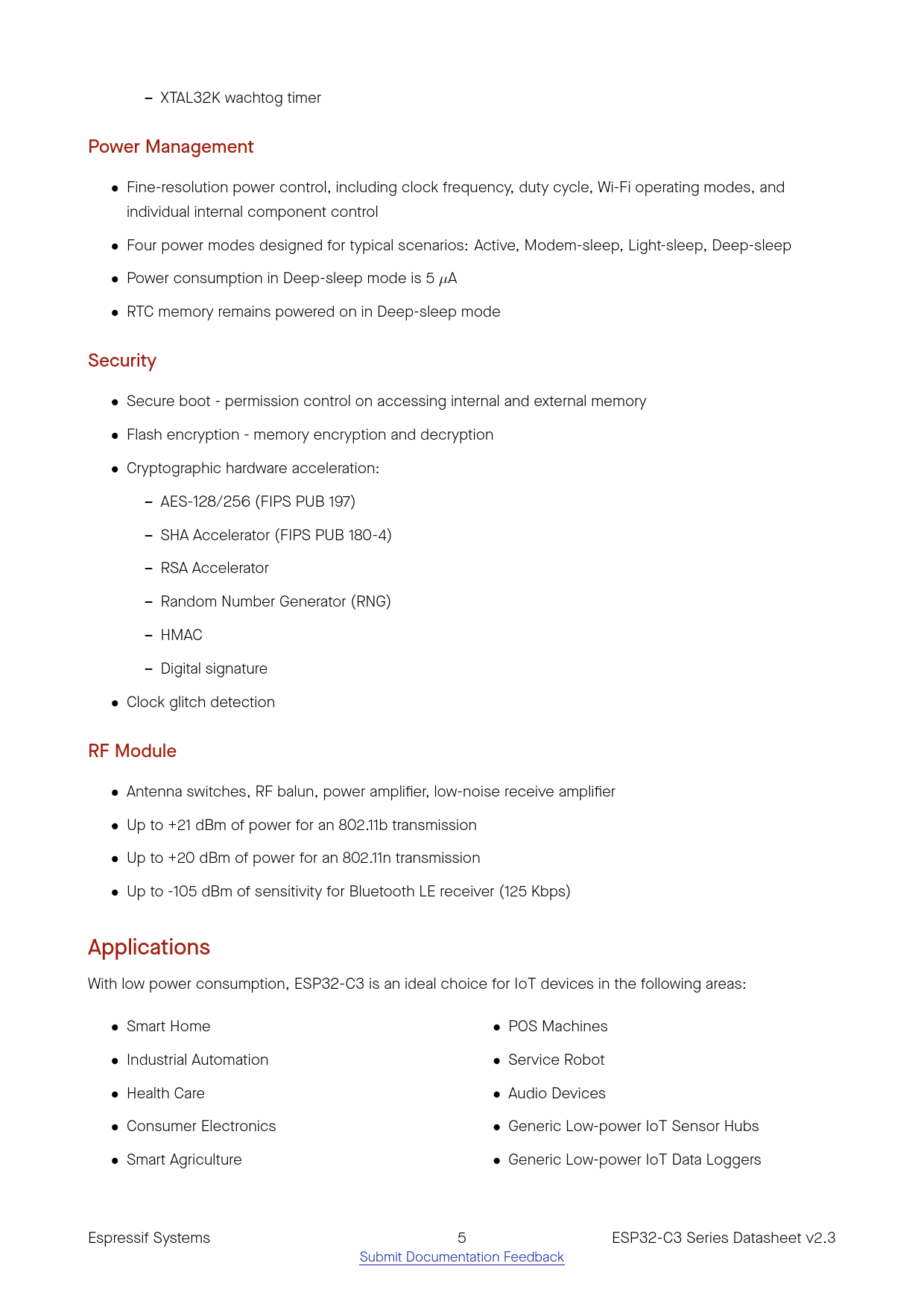 – XTAL32K wachtog timer Power Management • Fine-resolution power control, including clock frequency, duty cycle, Wi-Fi operating modes, and individual internal component control • Four power modes designed for typical scenarios: Active, Modem-sleep, Light-sleep, Deep-sleep • Power consumption in Deep-sleep mode is 5 µA • RTC memory remains powered on in Deep-sleep mode Security • Secure boot - permission control on accessing internal and external memory • Flash encryption - memory encryption and decryption • Cryptographic hardware acceleration: – AES-128/256 (FIPS PUB 197) – SHA Accelerator (FIPS PUB 180-4) – RSA Accelerator – Random Number Generator (RNG) – HMAC – Digital signature • Clock glitch detection RF Module • Antenna switches, RF balun, power amplifier, low-noise receive amplifier • Up to +21 dBm of power for an 802.11b transmission • Up to +20 dBm of power for an 802.11n transmission • Up to -105 dBm of sensitivity for Bluetooth LE receiver (125 Kbps) Applications With low power consumption, ESP32-C3 is an ideal choice for IoT devices in the following areas: • Smart Home • POS Machines • Industrial Automation • Service Robot • Health Care • Audio Devices • Consumer Electronics • Generic Low-power IoT Sensor Hubs • Smart Agriculture • Generic Low-power IoT Data Loggers Espressif Systems 5 ESP32-C3 Series Datasheet v2.3 Submit Documentation Feedback Document Outline Product Overview Features Applications 1 ESP32-C3 Series Comparison 1.1 Nomenclature 1.2 Comparison 1.3 Chip Revision 2 Pins 2.1 Pin Layout 2.2 Pin Overview 2.3 IO Pins 2.3.1 IO MUX Functions 2.3.2 Analog Functions 2.3.3 Restrictions for GPIOs 2.3.4 Peripheral Pin Assignment 2.4 Analog Pins 2.5 Power Supply 2.5.1 Power Pins 2.5.2 Power Scheme 2.5.3 Chip Power-up and Reset 2.6 Pin Mapping Between Chip and Flash 3 Boot Configurations 3.1 Chip Boot Mode Control 3.2 ROM Messages Printing Control 4 Functional Description 4.1 System 4.1.1 Microprocessor and Master 4.1.1.1 High-Performance CPU 4.1.1.2 GDMA Controller 4.1.2 Memory Organization 4.1.2.1 Internal Memory 4.1.2.2 External Memory 4.1.2.3 Cache 4.1.2.4 eFuse Controller 4.1.3 System Components 4.1.3.1 IO MUX and GPIO Matrix 4.1.3.2 Reset 4.1.3.3 Clock 4.1.3.4 Interrupt Matrix 4.1.3.5 System Timer 4.1.3.6 Power Management Unit 4.1.3.7 Timer Group 4.1.3.8 Watchdog Timers 4.1.3.9 XTAL32K Watchdog Timers (XTWDT) 4.1.3.10 Permission Control 4.1.3.11 World Controller (WCL) 4.1.3.12 System Registers 4.1.3.13 Debug Assistant 4.1.4 Cryptography and Security Component 4.1.4.1 AES Accelerator 4.1.4.2 HMAC Accelerator 4.1.4.3 RSA Accelerator 4.1.4.4 SHA Accelerator 4.1.4.5 Digital Signature 4.1.4.6 External Memory Encryption and Decryption 4.1.4.7 Random Number Generator 4.1.4.8 Clock Glitch Detection 4.2 Peripherals 4.2.1 Connectivity Interface 4.2.1.1 UART Controller 4.2.1.2 SPI Controller 4.2.1.3 I2C Controller 4.2.1.4 I2S Controller 4.2.1.5 USB Serial/JTAG Controller 4.2.1.6 Two-wire Automotive Interface 4.2.1.7 LED PWM Controller 4.2.1.8 Remote Control Peripheral 4.2.2 Analog Signal Processing 4.2.2.1 SAR ADC 4.2.2.2 Temperature Sensor 4.3 Wireless Communication 4.3.1 Radio 4.3.1.1 2.4 GHz Receiver 4.3.1.2 2.4 GHz Transmitter 4.3.1.3 Clock Generator 4.3.2 Wi-Fi 4.3.2.1 Wi-Fi Radio and Baseband 4.3.2.2 Wi-Fi MAC 4.3.2.3 Networking Features 4.3.3 Bluetooth LE 4.3.3.1 Bluetooth LE PHY 4.3.3.2 Bluetooth LE Link Controller 5 Electrical Characteristics 5.1 Absolute Maximum Ratings 5.2 Recommended Operating Conditions 5.3 VDD_SPI Output Characteristics 5.4 DC Characteristics (3.3 V, 25 °C) 5.5 ADC Characteristics 5.6 Current Consumption 5.6.1 RF Current Consumption in Active Mode 5.6.2 Current Consumption in Other Modes 5.7 Memory Specifications 5.8 Reliability 6 RF Characteristics 6.1 Wi-Fi Radio 6.1.1 Wi-Fi RF Transmitter (TX) Characteristics 6.1.2 Wi-Fi RF Receiver (RX) Characteristics 6.2 Bluetooth 5 (LE) Radio 6.2.1 Bluetooth LE RF Transmitter (TX) Characteristics 6.2.2 Bluetooth LE RF Receiver (RX) Characteristics 7 Packaging ESP32-C3 Consolidated Pin Overview ESP32-C3 Chip Series Group Overview Datasheet Versioning Glossary Related Documentation and Resources Revision History