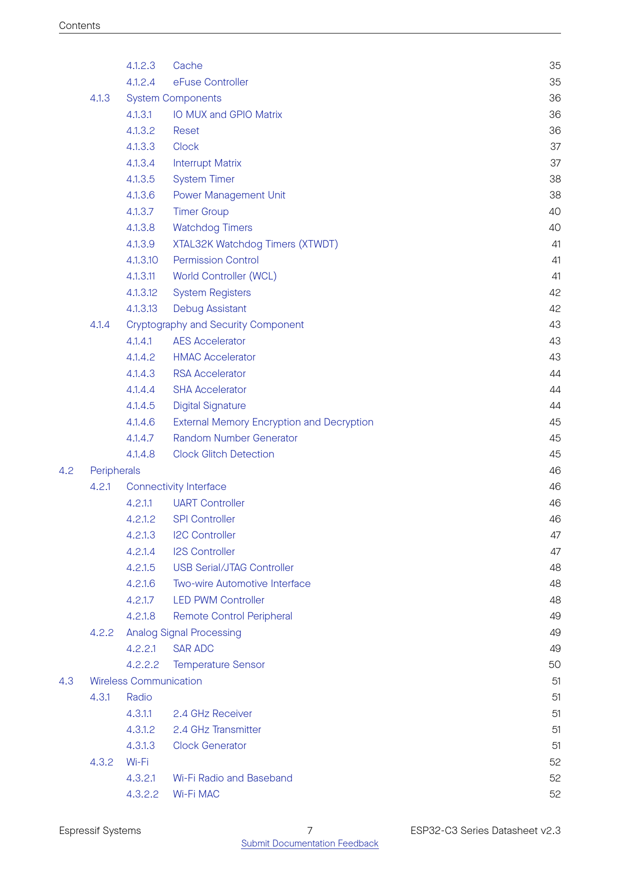 link to page 35 link to page 35 link to page 36 link to page 36 link to page 36 link to page 36 link to page 37 link to page 37 link to page 38 link to page 39 link to page 40 link to page 41 link to page 41 link to page 41 link to page 42 link to page 42 link to page 42 link to page 43 link to page 43 link to page 44 link to page 44 link to page 44 link to page 45 link to page 45 link to page 45 link to page 46 link to page 46 link to page 46 link to page 46 link to page 47 link to page 47 link to page 48 link to page 48 link to page 48 link to page 49 link to page 49 link to page 49 link to page 49 link to page 51 link to page 51 link to page 51 link to page 51 link to page 51 link to page 52 link to page 52 link to page 52 Contents 4.1.2.3 Cache 35 4.1.2.4 eFuse Controller 35 4.1.3 System Components 36 4.1.3.1 IO MUX and GPIO Matrix 36 4.1.3.2 Reset 36 4.1.3.3 Clock 37 4.1.3.4 Interrupt Matrix 37 4.1.3.5 System Timer 38 4.1.3.6 Power Management Unit 38 4.1.3.7 Timer Group 40 4.1.3.8 Watchdog Timers 40 4.1.3.9 XTAL32K Watchdog Timers (XTWDT) 41 4.1.3.10 Permission Control 41 4.1.3.11 World Controller (WCL) 41 4.1.3.12 System Registers 42 4.1.3.13 Debug Assistant 42 4.1.4 Cryptography and Security Component 43 4.1.4.1 AES Accelerator 43 4.1.4.2 HMAC Accelerator 43 4.1.4.3 RSA Accelerator 44 4.1.4.4 SHA Accelerator 44 4.1.4.5 Digital Signature 44 4.1.4.6 External Memory Encryption and Decryption 45 4.1.4.7 Random Number Generator 45 4.1.4.8 Clock Glitch Detection 45 4.2 Peripherals 46 4.2.1 Connectivity Interface 46 4.2.1.1 UART Controller 46 4.2.1.2 SPI Controller 46 4.2.1.3 I2C Controller 47 4.2.1.4 I2S Controller 47 4.2.1.5 USB Serial/JTAG Controller 48 4.2.1.6 Two-wire Automotive Interface 48 4.2.1.7 LED PWM Controller 48 4.2.1.8 Remote Control Peripheral 49 4.2.2 Analog Signal Processing 49 4.2.2.1 SAR ADC 49 4.2.2.2 Temperature Sensor 50 4.3 Wireless Communication 51 4.3.1 Radio 51 4.3.1.1 2.4 GHz Receiver 51 4.3.1.2 2.4 GHz Transmitter 51 4.3.1.3 Clock Generator 51 4.3.2 Wi-Fi 52 4.3.2.1 Wi-Fi Radio and Baseband 52 4.3.2.2 Wi-Fi MAC 52 Espressif Systems 7 ESP32-C3 Series Datasheet v2.3 Submit Documentation Feedback Document Outline Product Overview Features Applications 1 ESP32-C3 Series Comparison 1.1 Nomenclature 1.2 Comparison 1.3 Chip Revision 2 Pins 2.1 Pin Layout 2.2 Pin Overview 2.3 IO Pins 2.3.1 IO MUX Functions 2.3.2 Analog Functions 2.3.3 Restrictions for GPIOs 2.3.4 Peripheral Pin Assignment 2.4 Analog Pins 2.5 Power Supply 2.5.1 Power Pins 2.5.2 Power Scheme 2.5.3 Chip Power-up and Reset 2.6 Pin Mapping Between Chip and Flash 3 Boot Configurations 3.1 Chip Boot Mode Control 3.2 ROM Messages Printing Control 4 Functional Description 4.1 System 4.1.1 Microprocessor and Master 4.1.1.1 High-Performance CPU 4.1.1.2 GDMA Controller 4.1.2 Memory Organization 4.1.2.1 Internal Memory 4.1.2.2 External Memory 4.1.2.3 Cache 4.1.2.4 eFuse Controller 4.1.3 System Components 4.1.3.1 IO MUX and GPIO Matrix 4.1.3.2 Reset 4.1.3.3 Clock 4.1.3.4 Interrupt Matrix 4.1.3.5 System Timer 4.1.3.6 Power Management Unit 4.1.3.7 Timer Group 4.1.3.8 Watchdog Timers 4.1.3.9 XTAL32K Watchdog Timers (XTWDT) 4.1.3.10 Permission Control 4.1.3.11 World Controller (WCL) 4.1.3.12 System Registers 4.1.3.13 Debug Assistant 4.1.4 Cryptography and Security Component 4.1.4.1 AES Accelerator 4.1.4.2 HMAC Accelerator 4.1.4.3 RSA Accelerator 4.1.4.4 SHA Accelerator 4.1.4.5 Digital Signature 4.1.4.6 External Memory Encryption and Decryption 4.1.4.7 Random Number Generator 4.1.4.8 Clock Glitch Detection 4.2 Peripherals 4.2.1 Connectivity Interface 4.2.1.1 UART Controller 4.2.1.2 SPI Controller 4.2.1.3 I2C Controller 4.2.1.4 I2S Controller 4.2.1.5 USB Serial/JTAG Controller 4.2.1.6 Two-wire Automotive Interface 4.2.1.7 LED PWM Controller 4.2.1.8 Remote Control Peripheral 4.2.2 Analog Signal Processing 4.2.2.1 SAR ADC 4.2.2.2 Temperature Sensor 4.3 Wireless Communication 4.3.1 Radio 4.3.1.1 2.4 GHz Receiver 4.3.1.2 2.4 GHz Transmitter 4.3.1.3 Clock Generator 4.3.2 Wi-Fi 4.3.2.1 Wi-Fi Radio and Baseband 4.3.2.2 Wi-Fi MAC 4.3.2.3 Networking Features 4.3.3 Bluetooth LE 4.3.3.1 Bluetooth LE PHY 4.3.3.2 Bluetooth LE Link Controller 5 Electrical Characteristics 5.1 Absolute Maximum Ratings 5.2 Recommended Operating Conditions 5.3 VDD_SPI Output Characteristics 5.4 DC Characteristics (3.3 V, 25 °C) 5.5 ADC Characteristics 5.6 Current Consumption 5.6.1 RF Current Consumption in Active Mode 5.6.2 Current Consumption in Other Modes 5.7 Memory Specifications 5.8 Reliability 6 RF Characteristics 6.1 Wi-Fi Radio 6.1.1 Wi-Fi RF Transmitter (TX) Characteristics 6.1.2 Wi-Fi RF Receiver (RX) Characteristics 6.2 Bluetooth 5 (LE) Radio 6.2.1 Bluetooth LE RF Transmitter (TX) Characteristics 6.2.2 Bluetooth LE RF Receiver (RX) Characteristics 7 Packaging ESP32-C3 Consolidated Pin Overview ESP32-C3 Chip Series Group Overview Datasheet Versioning Glossary Related Documentation and Resources Revision History