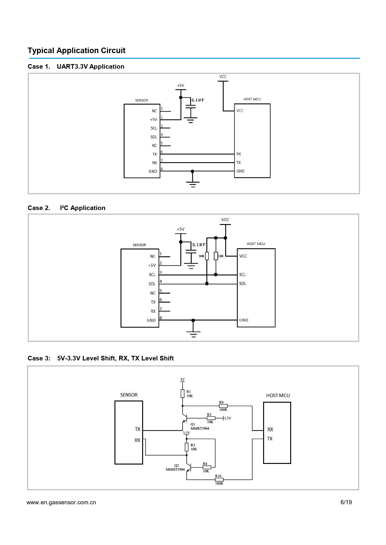Typical Application CircuitCase 1. UART3.3V ApplicationCase 2.I²C ApplicationCase 3: 5V-3.3V Level Shift, RX, TX Level Shift www.en.gassensor.com.cn 6/19 Document Outline Description Features Working Principle Specifications Dimensions and Connector 1.Dimensions (Unit mm, tolerance ±0.2 mm) Typical Application Circuit Case 1.UART3.3V Application Product Installation User Attention UART Communication Protocol 1. General Statement 2.Format of Serial Communication Protocol 3.Command Table of Serial Protocol Note: Example: 4.3 Set up and Read Particle Calibrated Coefficien Note: Description: 4.4 Close/Open Laser Diode Note: Note: Example: Note: Example: I²C Communication Protocol 1. Brief Introduction 2. Communication Common Description 3. Protocol Detailed Description 3.1Send Command Data 3.2Read Command Data Packing Information