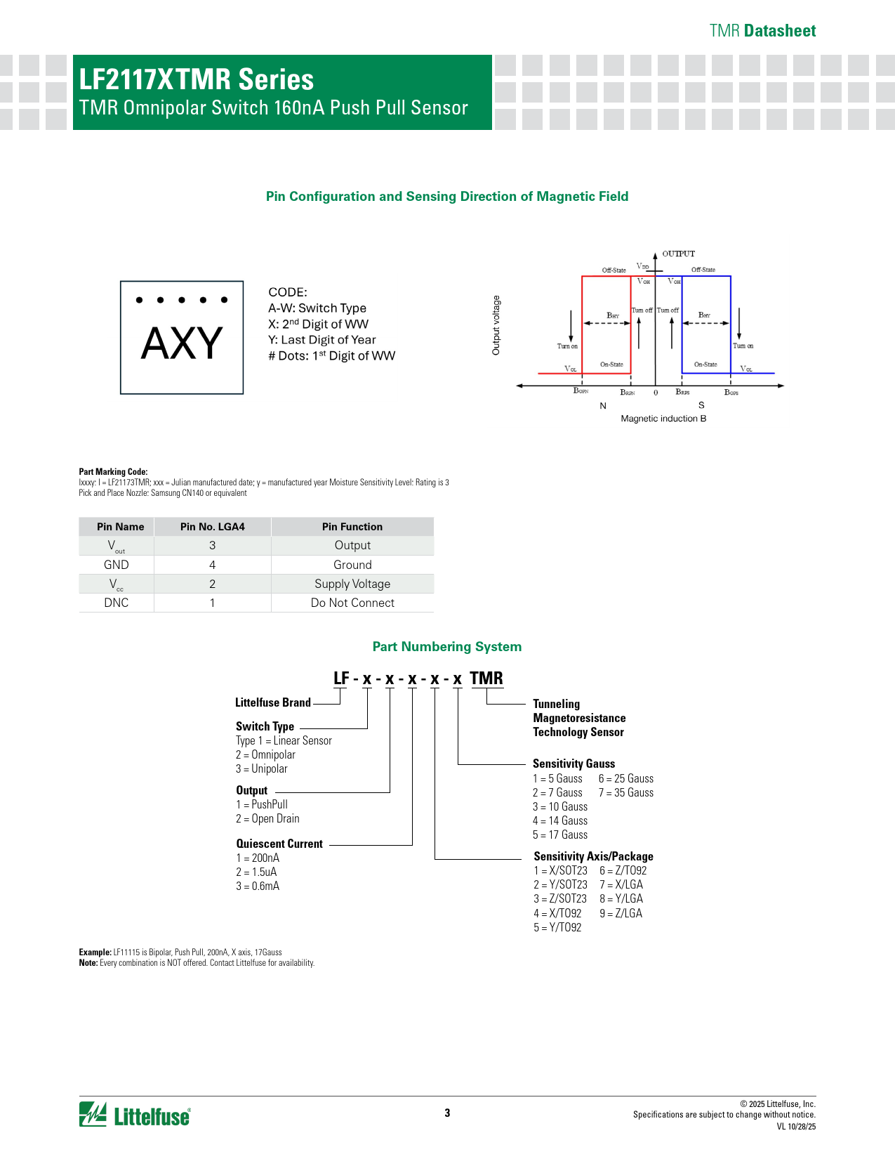 Part Numbering System LF - x - x - x - x - x TMR Littelfuse Brand Tunneling Magnetoresistance Switch Type Technology Sensor