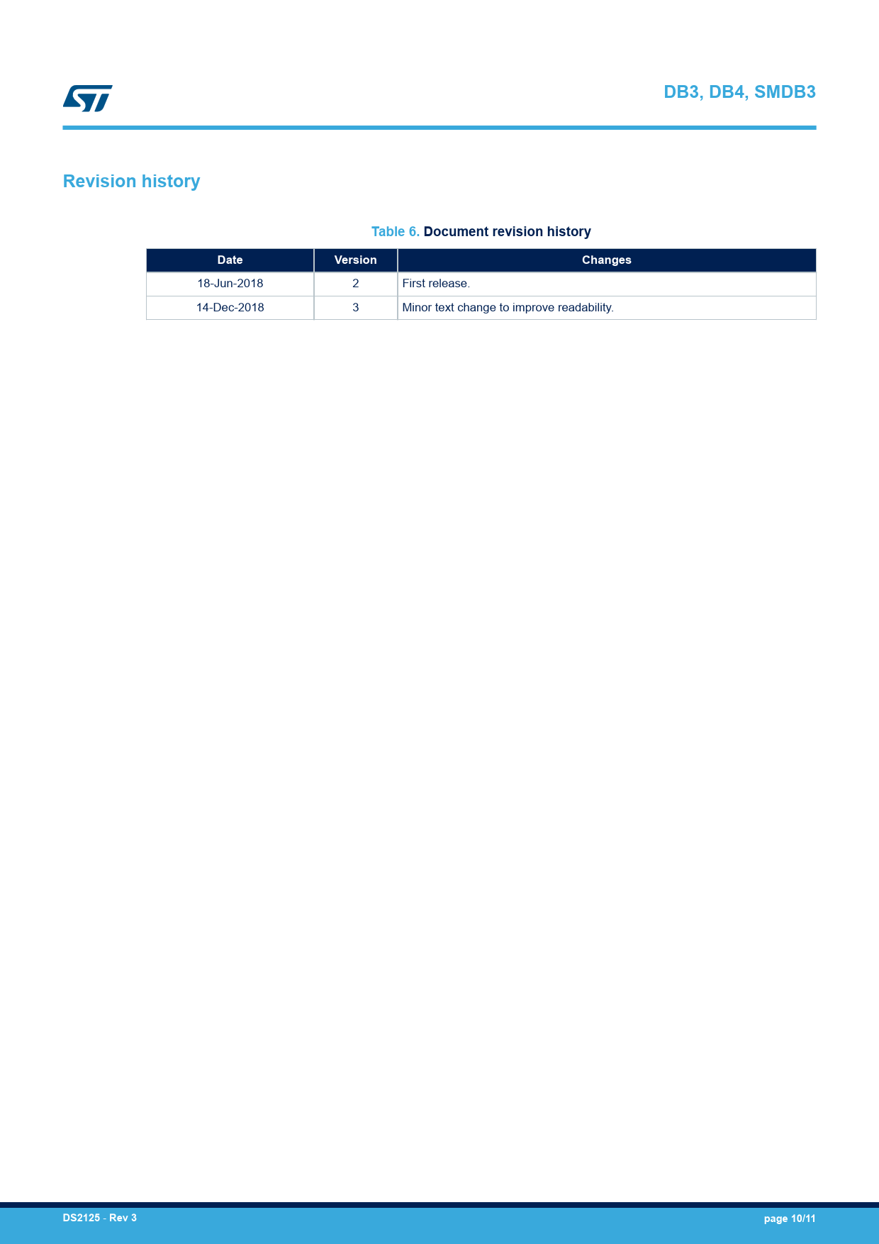 DB3, DB4, SMDB3. Revision history. Table 6. Document revision history. Date. Version. Changes. DS2125. Rev 3. page 10/11
