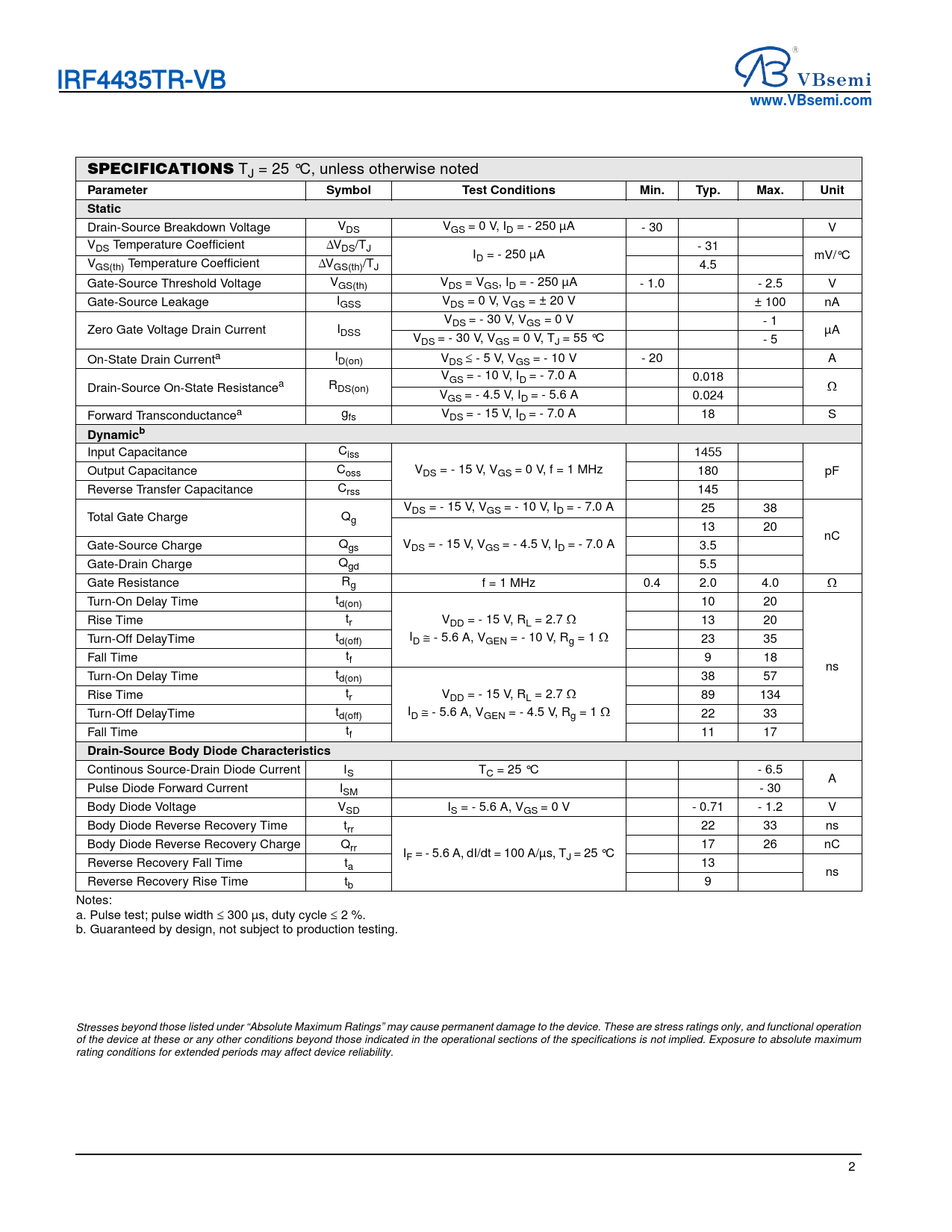IRF4435TR-VB. www.VBsemi.com SPECIFICATIONS TJ = 25 °C, unless otherwise noted
