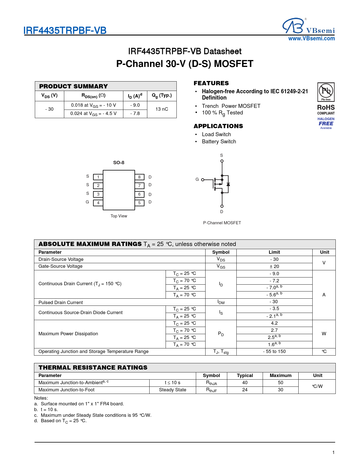 www.VBsemi.com IRF4435TRPBF-VB Datasheet P-Channel 30-V (D-S) MOSFET