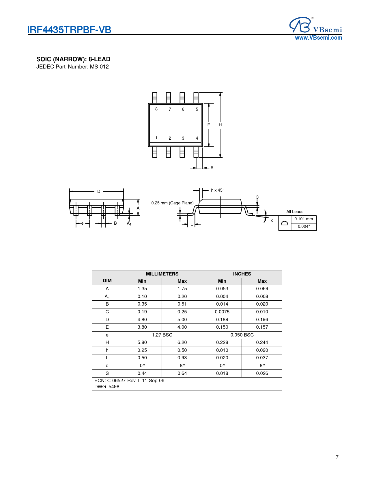 IRF4435TRPBF-VB. www.VBsemi.com SOIC (NARROW): 8-LEAD. JEDEC Part Number: MS-012 8 6 7 5 E. 1 3 2 H 4 S h x 45 D C