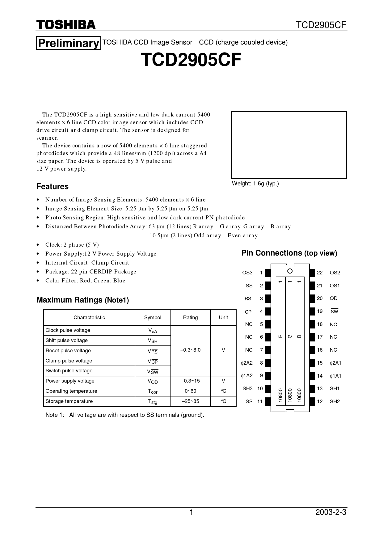 TCD2905CF TOSHIBA CCD Image Sensor CCD (charge coupled device) PreliminaryTCD2905CF The TCD2905CF is a high sensitive and low dark current 5400 elements × 6 line CCD color image sensor which includes CCD drive circuit and clamp circuit. The sensor is designed for scanner. The device contains a row of 5400 elements × 6 line staggered photodiodes which provide a 48 lines/mm (1200 dpi) across a A4 size paper. The device is operated by 5 V pulse and 12 V power supply. Features Weight: 1.6g (typ.) • Number of Image Sensing Elements: 5400 elements × 6 line • Image Sensing Element Size: 5.25 µm by 5.25 µm on 5.25 µm • Photo Sensing Region: High sensitive and low dark current PN photodiode • Distanced Between Photodiode Array: 63 µm (12 lines) R array – G array, G array – B array 10.5µm (2 lines) Odd array – Even array • Clock: 2 phase (5 V) • Power Supply:12 V Power Supply Voltage Pin Connections (top view) • Internal Circuit: Clamp Circuit • Package: 22 pin CERDIP Package OS3 1 22 OS2 • Color Filter: Red, Green, Blue 1 1 1 SS 2 21 OS1 Maximum Ratings (Note1) RS 3 20 OD CP 4 19 SW Characteristic Symbol Rating Unit NC 5 18 NC Clock pulse voltage VφA NC 6 R G B 17 NC Shift pulse voltage VSH Reset pulse voltage V − 7 16 NC NC RS 0.3~8.0 V Clamp pulse voltage VCP φ2A2 8 15 φ2A1 Switch pulse voltage VSW φ1A2 9 14 φ1A1 Power supply voltage VOD −0.3~15 V SH3 10 13 SH1 Operating temperature Topr 0~60 °C Storage temperature Tstg −25~85 °C SS 10800 10800 10800 11 12 SH2 Note 1: All voltage are with respect to SS terminals (ground). 1 2003-2-3