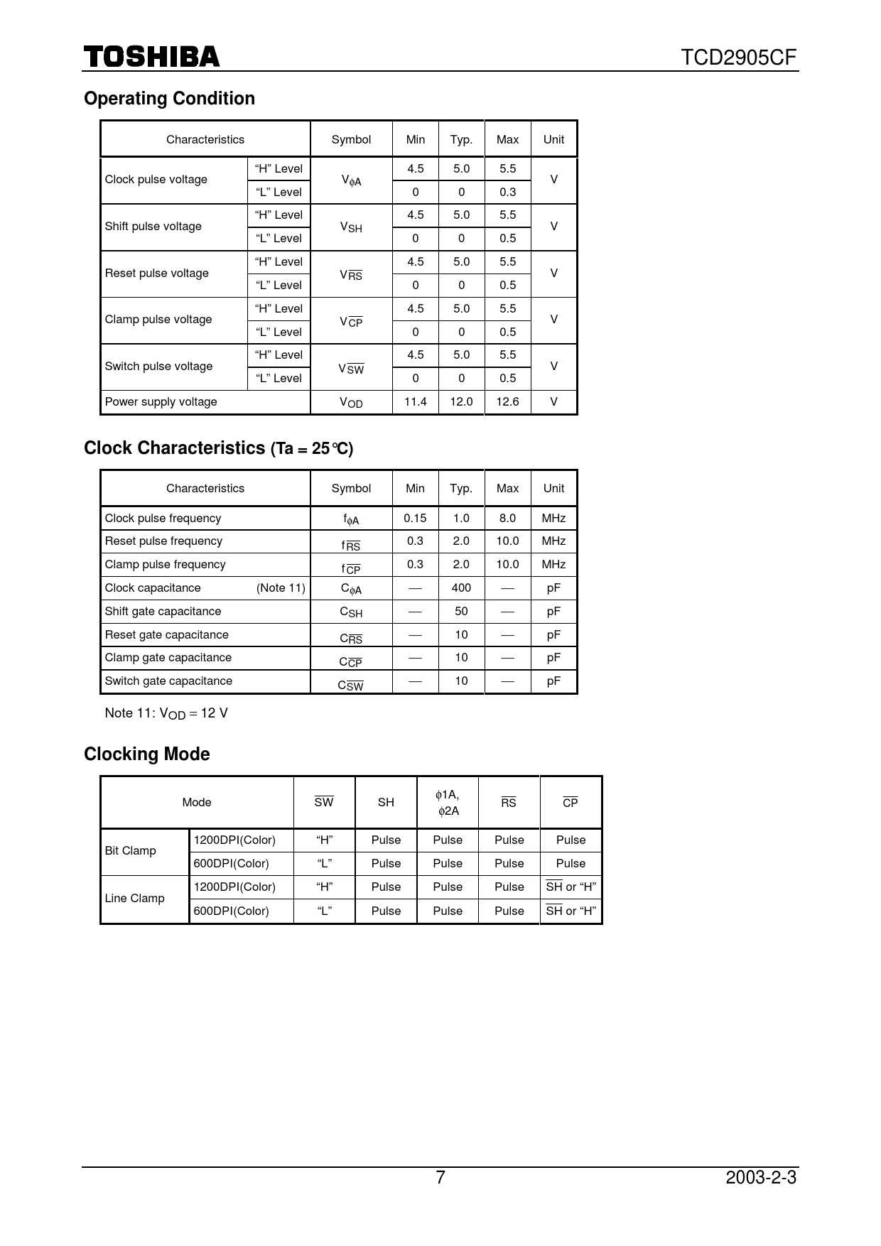 Characteristics Symbol Min Typ. Max Unit Clock pulse frequency fφA 0.15 1.0 8.0 MHz Reset pulse frequency f 0.3 2.0 10.0 MHz RS Clamp pulse frequency f 0.3 2.0 10.0 MHz CP Clock capacitance (Note 11) CφA 400 pF Shift gate capacitance CSH 50 pF Reset gate capacitance C 10 pF RS Clamp gate capacitance C 10 pF CP Switch gate capacitance C 10 pF SW Note 11: VOD = 12 V