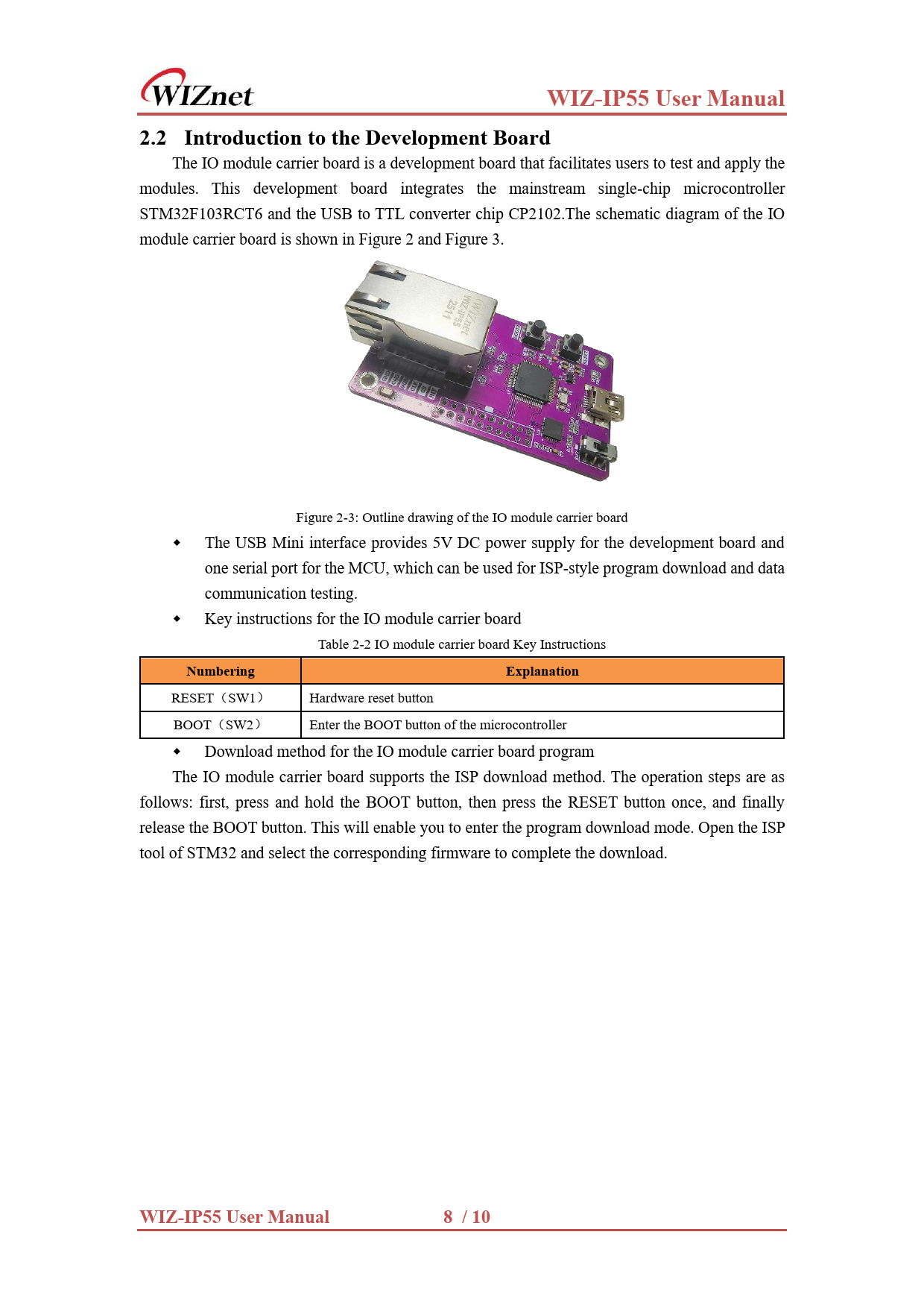 WIZ-IP55 User Manual. 2.2 Introduction to the Development Board. Numbering. Explanation. 8 / 10