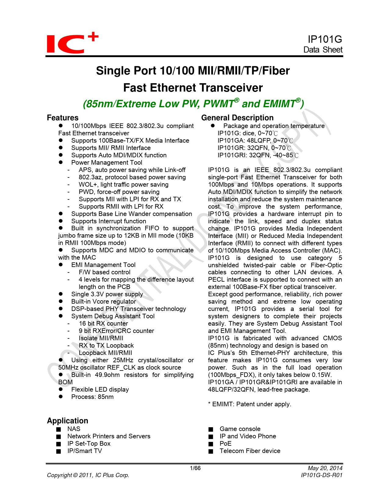 ■ NAS ■ Game console ■ Network Printers and Servers ■ IP and Video Phone ■ IP Set-Top Box ■ PoE ■ IP/Smart TV ■ Telecom Fiber device 1/66 May 20, 2014 Copyright © 2011, IC Plus Corp. IP101G-DS-R01 Document Outline Features comparison between IP101G and IP101A/IP101AH 1 Pin diagram 2 Dice pad information 3 Pin description 3.1 IP101GA pin description 3.2 IP101GR/GRI pin description 4 Register Descriptions 4.1 Register Page mode Control Register 4.2 MII Registers 4.3 MMD Control Register 4.4 MMD Data Register 4.5 RX Counter Register 4.6 LED Pin Control Register 4.7 WOL+ Control Register 4.8 UTP PHY Specific Control Register 4.9 Digital IO Pin Control Register 5 Function Description 5.1 Major Functional Block Description 5.1.1 Transmission Description 5.1.2 MII and Management Control Interface 5.1.3 RMII Interface 5.1.4 Flexible Clock Source 5.1.5 Auto-Negotiation and Related Information 5.1.6 Auto-MDIX function 5.2 PHY Address Configuration 5.3 Power Management Tool 5.3.1 Auto Power Saving Mode 5.3.2 IEEE802.3az EEE (Energy Efficient Ethernet) 5.3.3 Force power down 5.3.4 WOL+ operation mode 5.4 LED Mode Configuration 5.5 LED Blink Timing 5.6 Repeater Mode 5.7 Interrupt 5.8 Miscellaneous 5.9 Serial Management Interface 5.10 Fiber Mode Setting 5.11 Jumbo Frame 6 Layout Guideline 6.1 General Layout Guideline 6.2 Twisted Pair recommendation 7 Electrical Characteristics 7.1 Absolute Maximum Rating 7.2 DC Characteristics 7.3 Crystal Specifications 7.4 AC Timing 7.4.1 Reset, Pin Latched-in, Clock and Power Source 7.4.2 MII Timing 7.4.3 RMII Timing 7.4.4 SMI Timing 7.4.5 MDI to MII latency delay time 7.5 Thermal Data 8 Order Information 9 Physical Dimensions 9.1 48-PIN LQFP 9.2 32-PIN QFN