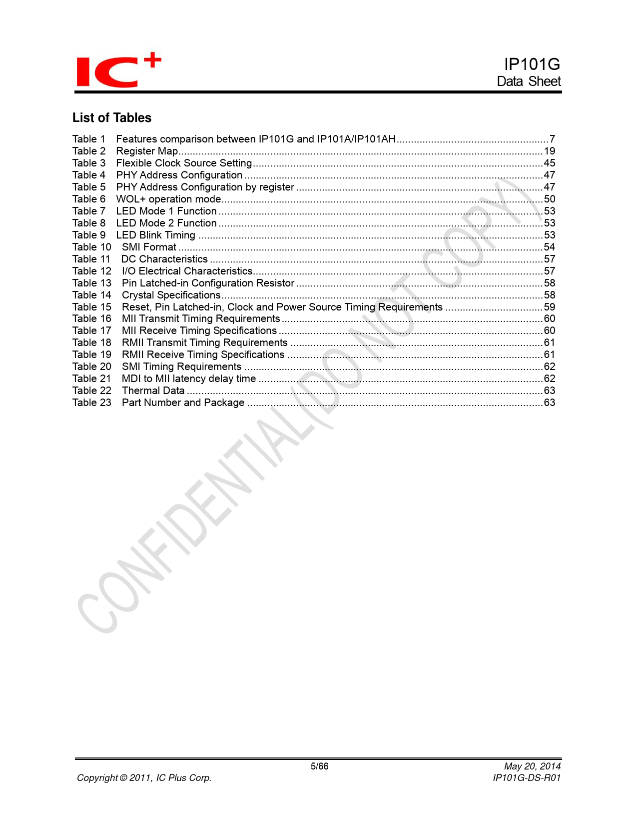 Table 1 Features comparison between IP101G and IP101A/IP101AH...7 Table 2 Register Map...19 Table 3 Flexible Clock Source Setting...45 Table 4 PHY Address Configuration ..47 Table 5 PHY Address Configuration by register ..47 Table 6 WOL+ operation mode..50 Table 7 LED Mode 1 Function ...53 Table 8 LED Mode 2 Function ...53 Table 9 LED Blink Timing ..53 Table 10 SMI Format ...54 Table 11 DC Characteristics ..57 Table 12 I/O Electrical Characteristics...57 Table 13 Pin Latched-in Configuration Resistor ..58 Table 14 Crystal Specifications..58 Table 15 Reset, Pin Latched-in, Clock and Power Source Timing Requirements ..59 Table 16 MII Transmit Timing Requirements ...60 Table 17 MII Receive Timing Specifications ..60 Table 18 RMII Transmit Timing Requirements ..61 Table 19 RMII Receive Timing Specifications ...61 Table 20 SMI Timing Requirements ..62 Table 21 MDI to MII latency delay time ...62 Table 22 Thermal Data ..63 Table 23 Part Number and Package ...63 5/66 May 20, 2014 Copyright © 2011, IC Plus Corp. IP101G-DS-R01 Document Outline Features comparison between IP101G and IP101A/IP101AH 1 Pin diagram 2 Dice pad information 3 Pin description 3.1 IP101GA pin description 3.2 IP101GR/GRI pin description 4 Register Descriptions 4.1 Register Page mode Control Register 4.2 MII Registers 4.3 MMD Control Register 4.4 MMD Data Register 4.5 RX Counter Register 4.6 LED Pin Control Register 4.7 WOL+ Control Register 4.8 UTP PHY Specific Control Register 4.9 Digital IO Pin Control Register 5 Function Description 5.1 Major Functional Block Description 5.1.1 Transmission Description 5.1.2 MII and Management Control Interface 5.1.3 RMII Interface 5.1.4 Flexible Clock Source 5.1.5 Auto-Negotiation and Related Information 5.1.6 Auto-MDIX function 5.2 PHY Address Configuration 5.3 Power Management Tool 5.3.1 Auto Power Saving Mode 5.3.2 IEEE802.3az EEE (Energy Efficient Ethernet) 5.3.3 Force power down 5.3.4 WOL+ operation mode 5.4 LED Mode Configuration 5.5 LED Blink Timing 5.6 Repeater Mode 5.7 Interrupt 5.8 Miscellaneous 5.9 Serial Management Interface 5.10 Fiber Mode Setting 5.11 Jumbo Frame 6 Layout Guideline 6.1 General Layout Guideline 6.2 Twisted Pair recommendation 7 Electrical Characteristics 7.1 Absolute Maximum Rating 7.2 DC Characteristics 7.3 Crystal Specifications 7.4 AC Timing 7.4.1 Reset, Pin Latched-in, Clock and Power Source 7.4.2 MII Timing 7.4.3 RMII Timing 7.4.4 SMI Timing 7.4.5 MDI to MII latency delay time 7.5 Thermal Data 8 Order Information 9 Physical Dimensions 9.1 48-PIN LQFP 9.2 32-PIN QFN