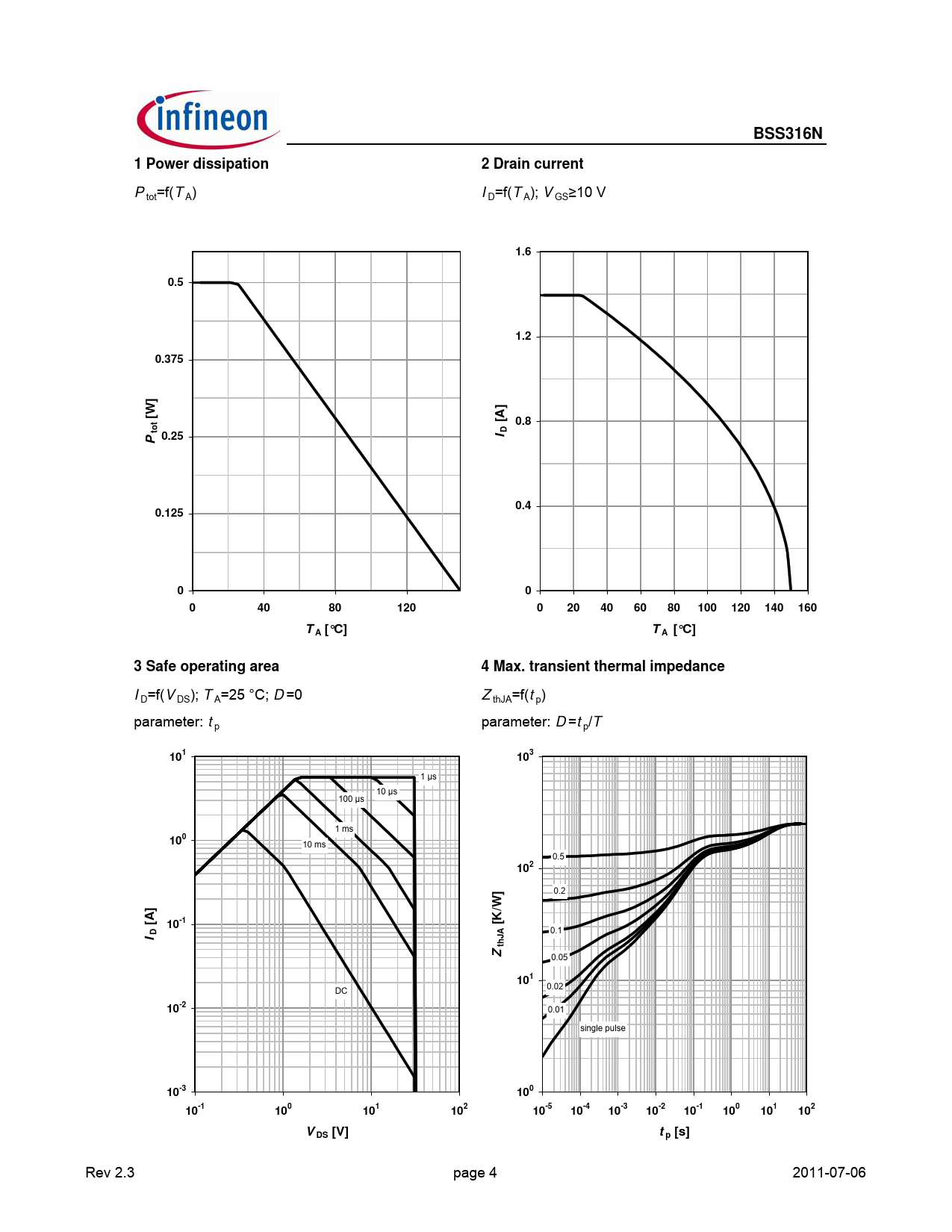 BSS316N. 1 Power dissipation. 2 Drain current. 1.6. 0.5. 1.2. 0.375. [W]. [A] 0.8. tot 0.25. 0.4. 0.125. 120. 100. 140. 160. A [°C]. [°C]