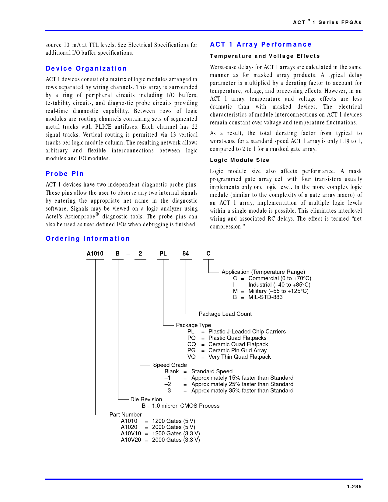 Application (Temperature Range) C = Commercial (0 to +70°C) I = Industrial (–40 to +85°C) M = Military (–55 to +125°C) B = MIL-STD-883 Package Lead Count Package Type PL = Plastic J-Leaded Chip Carriers PQ = Plastic Quad Flatpacks CQ = Ceramic Quad Flatpack PG = Ceramic Pin Grid Array VQ = Very Thin Quad Flatpack Speed Grade Blank = Standard Speed –1 = Approximately 15% faster than Standard –2 = Approximately 25% faster than Standard –3 = Approximately 35% faster than Standard Die Revision B = 1.0 micron CMOS Process Part Number A1010 = 1200 Gates (5 V) A1020 = 2000 Gates (5 V) A10V10 = 1200 Gates (3.3 V) A10V20 = 2000 Gates (3.3 V)
