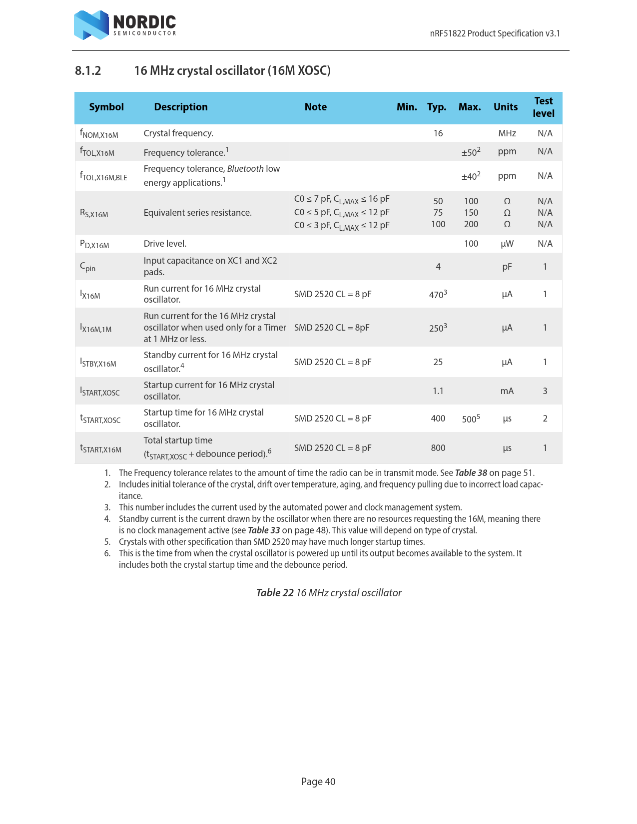 8.1.2. 16 MHz crystal oscillator (16M XOSC). Test. Symbol. Description. Note. Min. Typ. Max. Units. level. Table 38. Table 33. Table 22