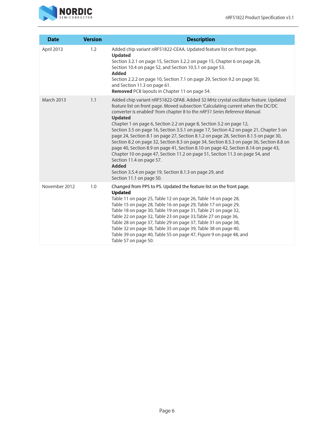 PCB layouts in Chapter 11 on page 54. March 2013 1.1 Added chip variant nRF51822-QFAB. Added 32 MHz crystal oscillator feature. Updated feature list on front page. Moved subsection ‘Calculating current when the DC/DC converter is enabled’ from chapter 8 to the nRF51 Series Reference Manual.