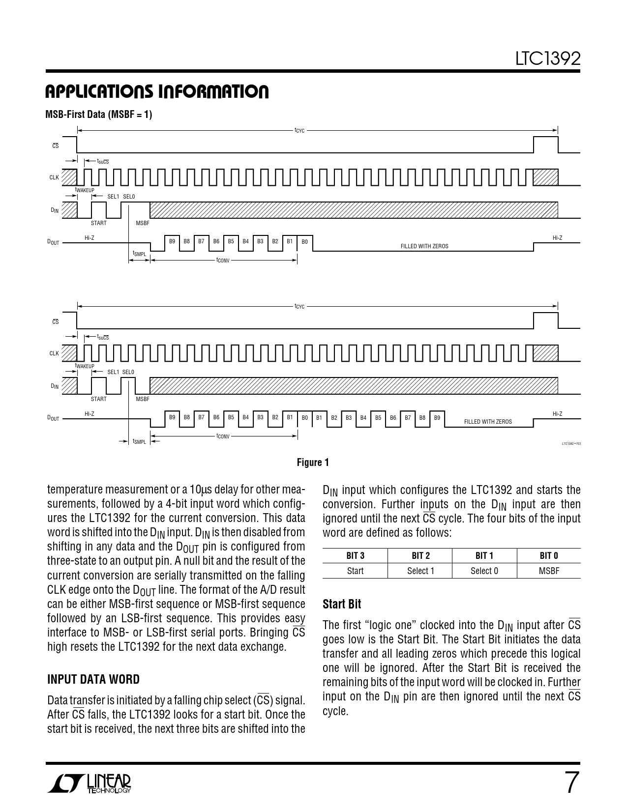 remaining bits of the input word will be clocked in. Further Data transfer is initiated by a falling chip select (CS) signal. input on the DIN pin are then ignored until the next CS After CS falls, the LTC1392 looks for a start bit. Once the cycle. start bit is received, the next three bits are shifted into the 7