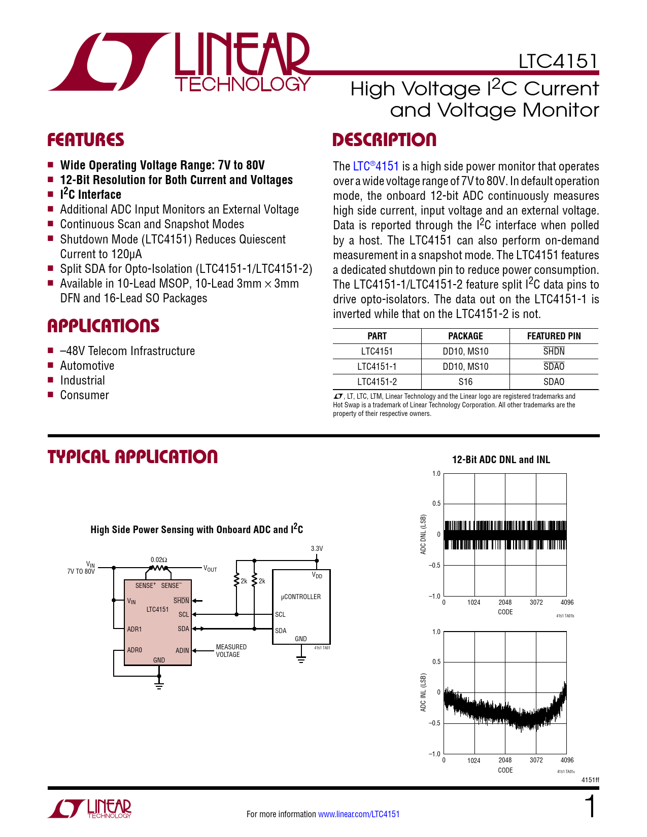 LTC4151 High Voltage I2C Current and Voltage Monitor FeaTuresDescripTion n Wide Operating Voltage Range: 7V to 80V The LTC®4151 is a high side power monitor that operates n 12-Bit Resolution for Both Current and Voltages over a wide voltage range of 7V to 80V. In default operation n I2C Interface mode, the onboard 12-bit ADC continuously measures n Additional ADC Input Monitors an External Voltage high side current, input voltage and an external voltage. n Continuous Scan and Snapshot Modes Data is reported through the I2C interface when polled n Shutdown Mode (LTC4151) Reduces Quiescent by a host. The LTC4151 can also perform on-demand Current to 120µA measurement in a snapshot mode. The LTC4151 features n Split SDA for Opto-Isolation (LTC4151-1/LTC4151-2) a dedicated shutdown pin to reduce power consumption. n Available in 10-Lead MSOP, 10-Lead 3mm × 3mm The LTC4151-1/LTC4151-2 feature split I2C data pins to DFN and 16-Lead SO Packages drive opto-isolators. The data out on the LTC4151-1 is inverted while that on the LTC4151-2 is not. applicaTionsPARTPACKAGEFEATURED PIN n –48V Telecom Infrastructure LTC4151 DD10, MS10 SHDN n Automotive LTC4151-1 DD10, MS10 SDAO n Industrial LTC4151-2 S16 SDAO n Consumer L, LT, LTC, LTM, Linear Technology and the Linear logo are registered trademarks and Hot Swap is a trademark of Linear Technology Corporation. All other trademarks are the property of their respective owners. Typical applicaTion12-Bit ADC DNL and INL 1.0 0.5 High Side Power Sensing with Onboard ADC and I2C 0 3.3V ADC DNL (LSB) 0.02Ω VIN –0.5 7V TO 80V VOUT VDD 2k 2k SENSE+ SENSE– µCONTROLLER –1.0 VIN SHDN 0 1024 2048 3072 4096 LTC4151 SCL SCL CODE 4151 TA01b ADR1 SDA SDA 1.0 GND MEASURED 4151 TA01 ADR0 ADIN VOLTAGE GND 0.5 0 ADC INL (LSB) –0.5 –1.0 0 1024 2048 3072 4096 CODE 4151 TA01c 4151ff For more information www.linear.com/LTC4151 1 Document Outline Features Applications Description Typical Application Absolute Maximum Ratings Pin Configuration Order Information Electrical Characteristics Typical Performance Characteristics Pin Functions Block Diagram Operation Applications Information Typical Application Package Description Revision History Typical Application Related Parts