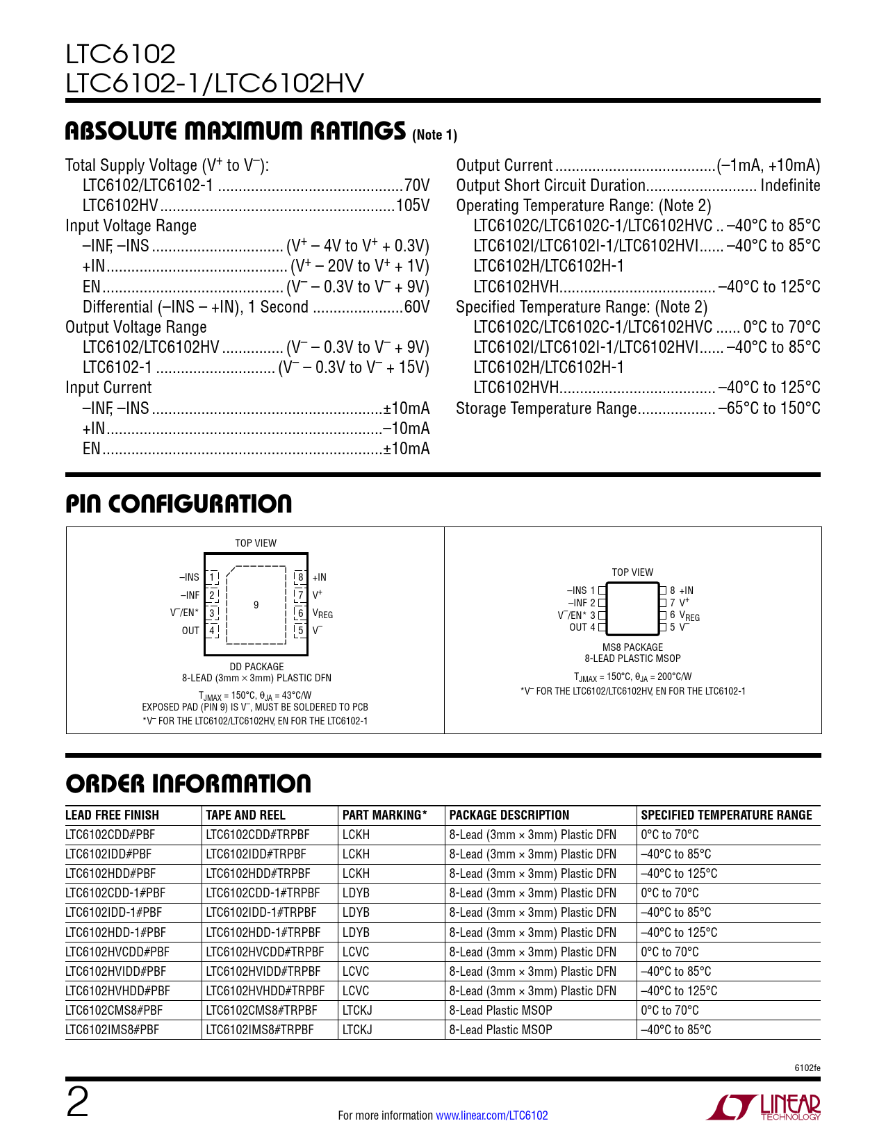 LTC6102CDD#PBF LTC6102CDD#TRPBF LCKH 8-Lead (3mm × 3mm) Plastic DFN 0°C to 70°C LTC6102IDD#PBF LTC6102IDD#TRPBF LCKH 8-Lead (3mm × 3mm) Plastic DFN –40°C to 85°C LTC6102HDD#PBF LTC6102HDD#TRPBF LCKH 8-Lead (3mm × 3mm) Plastic DFN –40°C to 125°C LTC6102CDD-1#PBF LTC6102CDD-1#TRPBF LDYB 8-Lead (3mm × 3mm) Plastic DFN 0°C to 70°C LTC6102IDD-1#PBF LTC6102IDD-1#TRPBF LDYB 8-Lead (3mm × 3mm) Plastic DFN –40°C to 85°C LTC6102HDD-1#PBF LTC6102HDD-1#TRPBF LDYB 8-Lead (3mm × 3mm) Plastic DFN –40°C to 125°C LTC6102HVCDD#PBF LTC6102HVCDD#TRPBF LCVC 8-Lead (3mm × 3mm) Plastic DFN 0°C to 70°C LTC6102HVIDD#PBF LTC6102HVIDD#TRPBF LCVC 8-Lead (3mm × 3mm) Plastic DFN –40°C to 85°C LTC6102HVHDD#PBF LTC6102HVHDD#TRPBF LCVC 8-Lead (3mm × 3mm) Plastic DFN –40°C to 125°C LTC6102CMS8#PBF LTC6102CMS8#TRPBF LTCKJ 8-Lead Plastic MSOP 0°C to 70°C LTC6102IMS8#PBF LTC6102IMS8#TRPBF LTCKJ 8-Lead Plastic MSOP –40°C to 85°C 6102fe 2 For more information www.linear.com/LTC6102