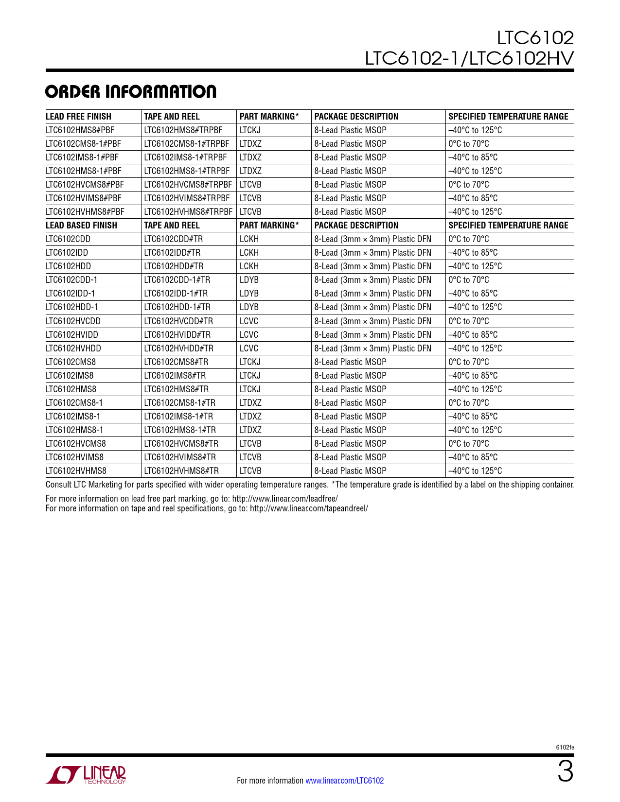 LTC6102HMS8#PBF LTC6102HMS8#TRPBF LTCKJ 8-Lead Plastic MSOP –40°C to 125°C LTC6102CMS8-1#PBF LTC6102CMS8-1#TRPBF LTDXZ 8-Lead Plastic MSOP 0°C to 70°C LTC6102IMS8-1#PBF LTC6102IMS8-1#TRPBF LTDXZ 8-Lead Plastic MSOP –40°C to 85°C LTC6102HMS8-1#PBF LTC6102HMS8-1#TRPBF LTDXZ 8-Lead Plastic MSOP –40°C to 125°C LTC6102HVCMS8#PBF LTC6102HVCMS8#TRPBF LTCVB 8-Lead Plastic MSOP 0°C to 70°C LTC6102HVIMS8#PBF LTC6102HVIMS8#TRPBF LTCVB 8-Lead Plastic MSOP –40°C to 85°C LTC6102HVHMS8#PBF LTC6102HVHMS8#TRPBF LTCVB 8-Lead Plastic MSOP –40°C to 125°C