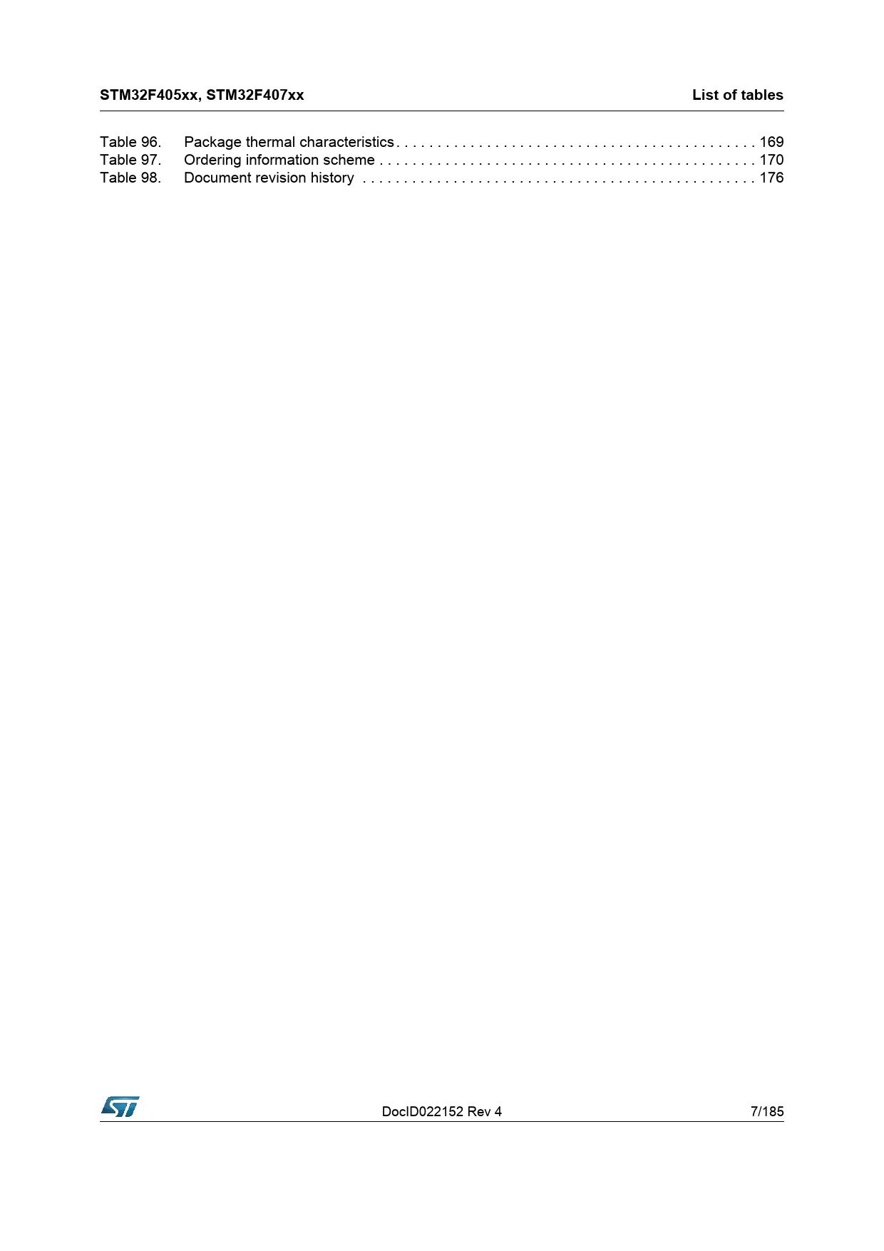 | Páginas / Página | 185 / 7 — STM32F405xx, STM32F407xx. List of tables |