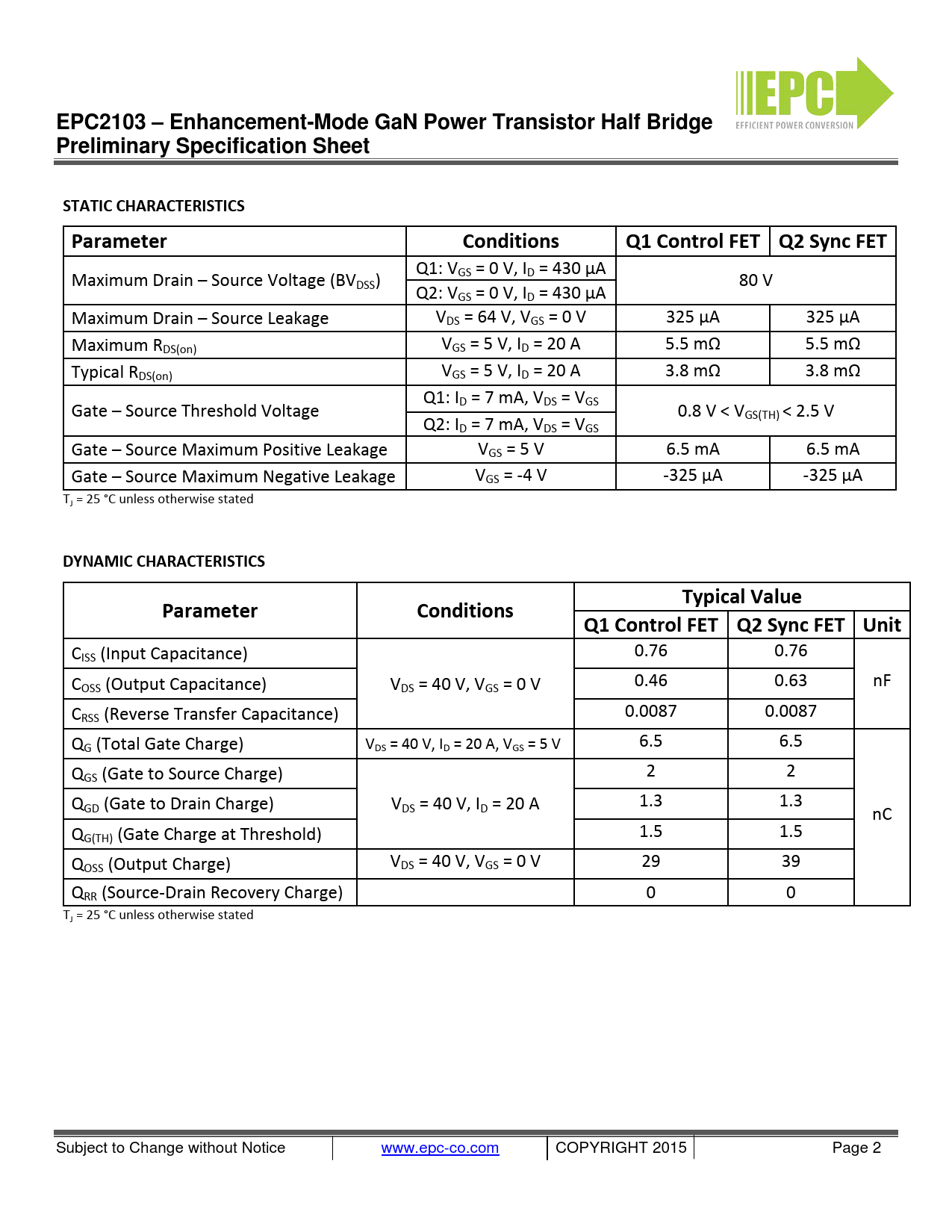 EPC2103 – Enhancement-Mode GaN Power Transistor Half Bridge Preliminary Specification Sheet STATIC CHARACTERISTICS Parameter Conditions Q1 Control FET Q2 Sync FET